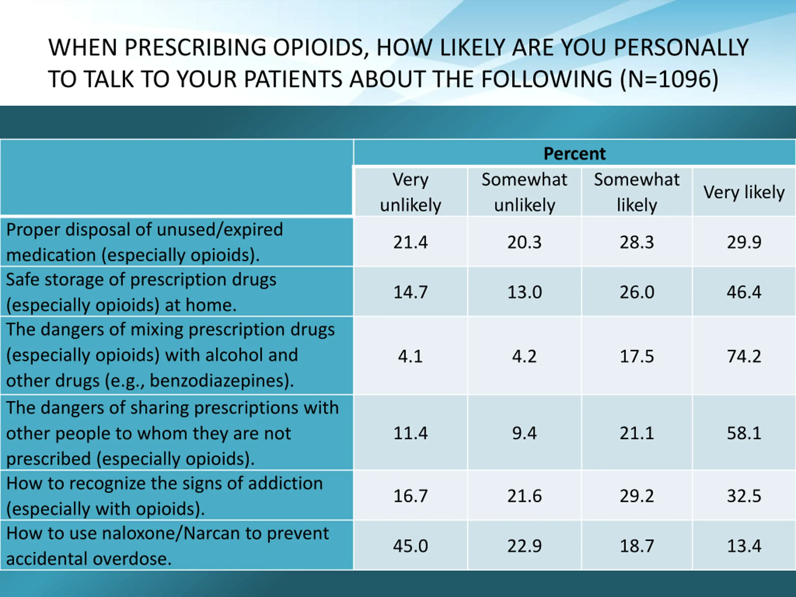WHEN PRESCRIBING OPIOIDS, HOW LIKELY ARE YOU PERSONALLY TO TALK TO YOUR PATIENTS ABOUT THE FOLLOWING (N=1096) Percent Very unlikely Somewhat unlikely Somewhat likely Very likely Proper disposal of unused/expired medication (especially opioids). Safe storage of prescription drugs (especially opioids) at home. The dangers of mixing prescription drugs (especially opioids) with alcohol and other drugs (e.g., benzodiazepines). The dangers of sharing prescriptions with other people to whom they are not prescribed (especially opioids). How to recognize the signs of addiction (especially with opioids). How to use naloxone/Narcan to prevent accidental overdose. 21.4 20.3 28.3 29.9 14.7 13.0 26.0 46.4 4.1 4.2 17.5 74.2 11.4 9.4 21.1 58.1 16.7 21.6 29.2 32.5 45.0 22.9 18.7 13.4