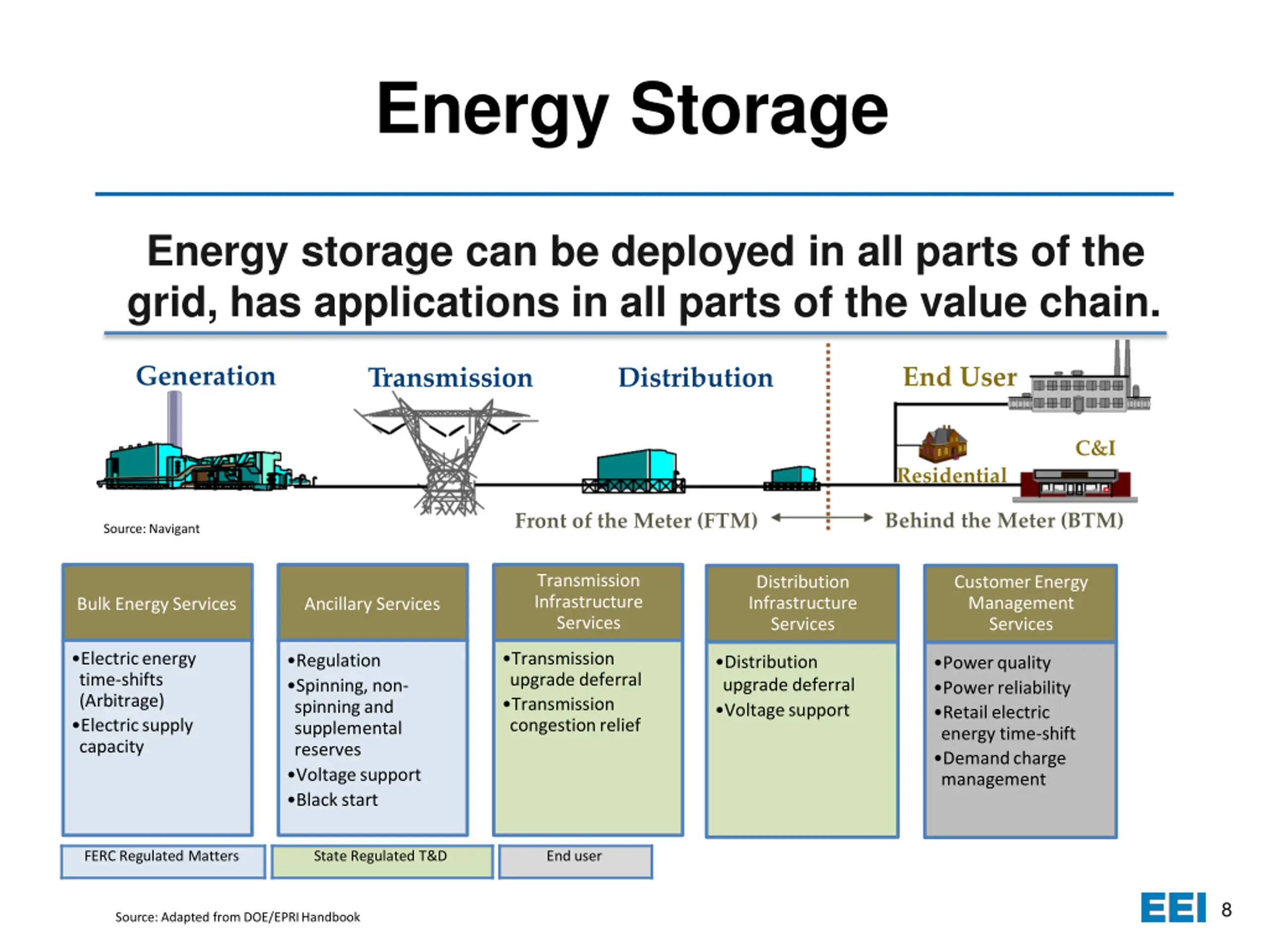 Energy Storage Energy storage can be deployed in all parts of the grid, has applications in all parts of the value chain. Generation End User Transmission Distribution C&I Residential Behind the Meter (BTM) Front of the Meter (FTM) Source: Navigant Transmission Infrastructure Services Distribution Infrastructure Services CustomerEnergy Management Services Bulk EnergyServices Ancillary Services Electricenergy time-shifts (Arbitrage) Electricsupply capacity Transmission upgrade deferral Transmission congestionrelief Regulation Spinning, non- spinningand supplemental reserves Voltagesupport Blackstart Distribution upgrade deferral Voltagesupport Powerquality Powerreliability Retailelectric energy time-shift Demandcharge management FERC Regulated Matters State Regulated T&D End user 8 Source: Adapted from DOE/EPRIHandbook