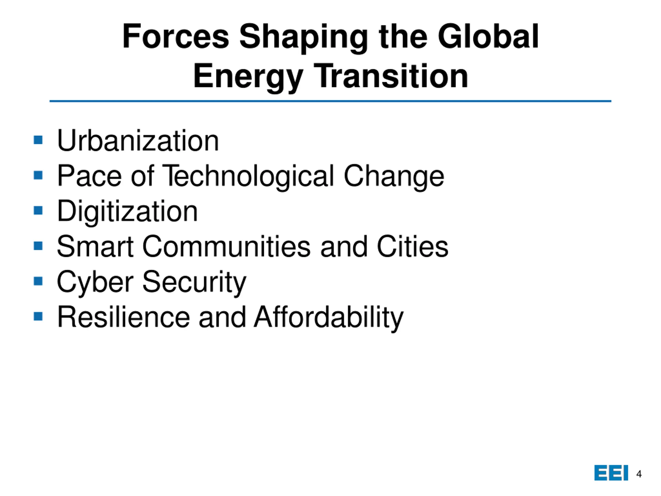 Forces Shaping the Global Energy Transition Urbanization Pace of T echnological Change Digitization Smart Communities and Cities Cyber Security Resilience and Affordability 4