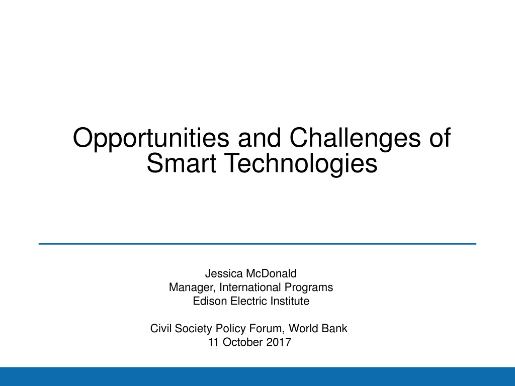Jessica McDonald, Manager at Edison Electric Institute, discusses the opportunities and challenges of smart technologies at the Civil Society Policy Forum World Bank in 2017. The presentation covers the impact of smart technologies on the global electric power industry, including the forces shaping the energy transition, innovation in science, regulation, and policy, individualized customer services, and technology drivers for smarter infrastructure. Additionally, it explores the role of energy storage in various parts of the grid and value chain.