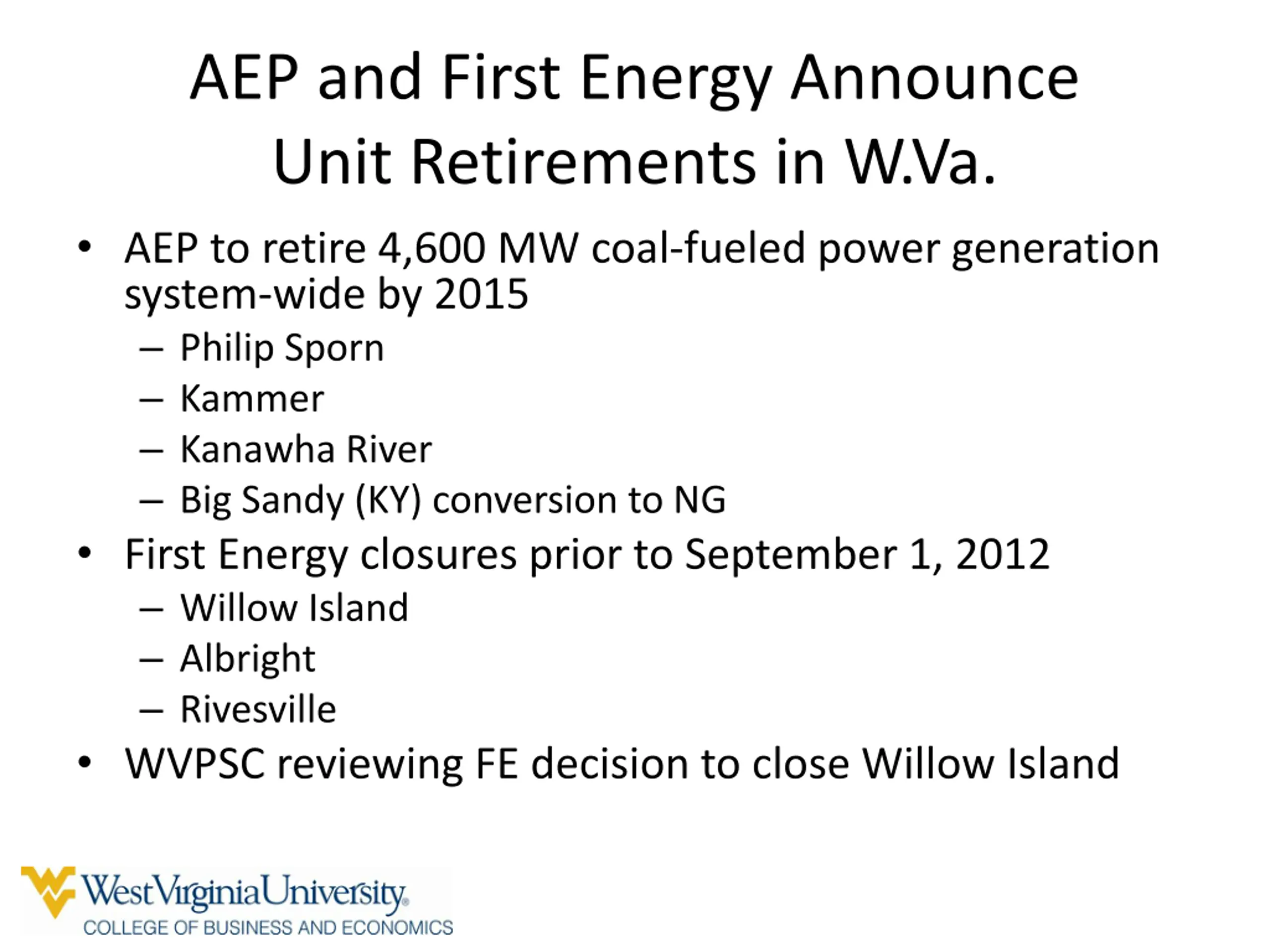 AEP and First Energy Announce Unit Retirements in W.Va. AEP to retire 4,600 MW coal-fueled power generation system-wide by 2015 Philip Sporn Kammer Kanawha River Big Sandy (KY) conversion to NG First Energy closures prior to September 1, 2012 Willow Island Albright Rivesville WVPSC reviewing FE decision to close Willow Island