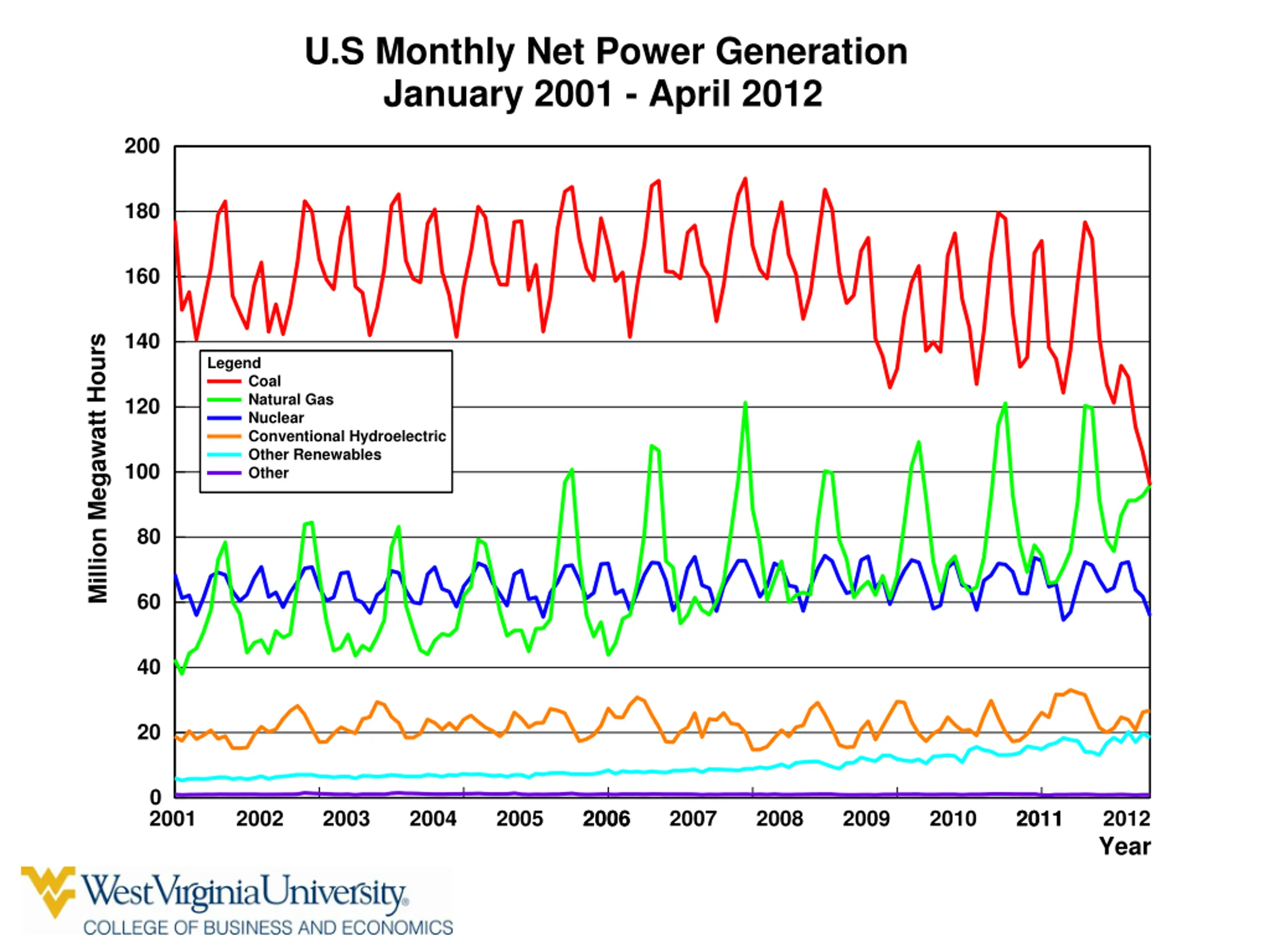 U.S Monthly Net Power Generation January 2001 - April 2012 200 180 160 140 Million Megawatt Hours Legend Coal Natural Gas Nuclear Conventional Hydroelectric Other Renewables Other 120 100 80 60 40 20 0 2001 2002 2003 2004 2005 2006 2006 2007 2008 2009 2010 2011 2011 2012 Year