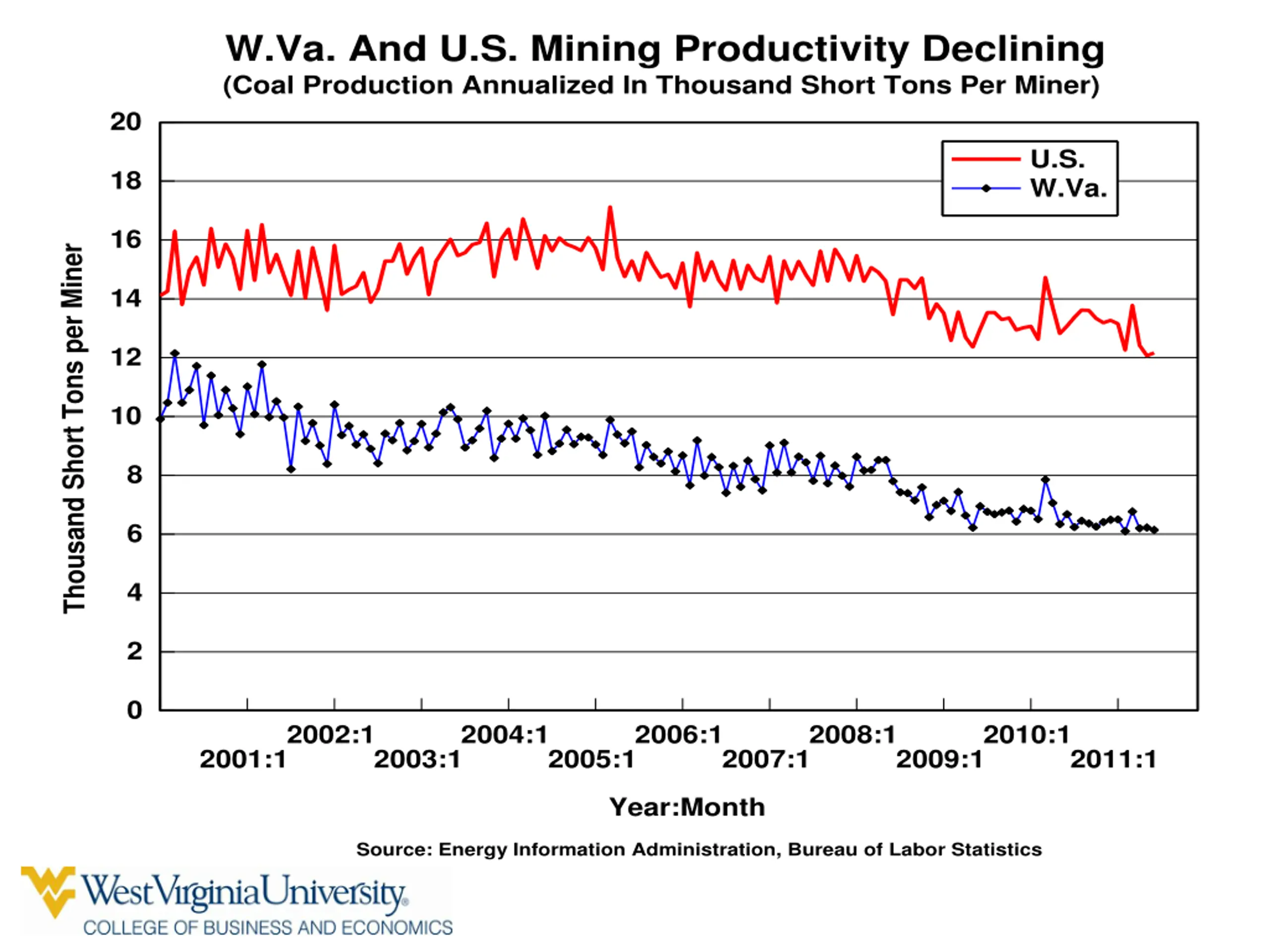 W.Va. And U.S. Mining Productivity Declining (Coal Production Annualized In Thousand Short Tons Per Miner) 20 U.S. W.Va. 18 16 Thousand Short Tons per Miner 14 12 10 8 6 4 2 0 2002:1 2004:1 2006:1 2008:1 2010:1 2001:1 2003:1 2005:1 2007:1 2009:1 2011:1 Year:Month Source: Energy Information Administration, Bureau of Labor Statistics