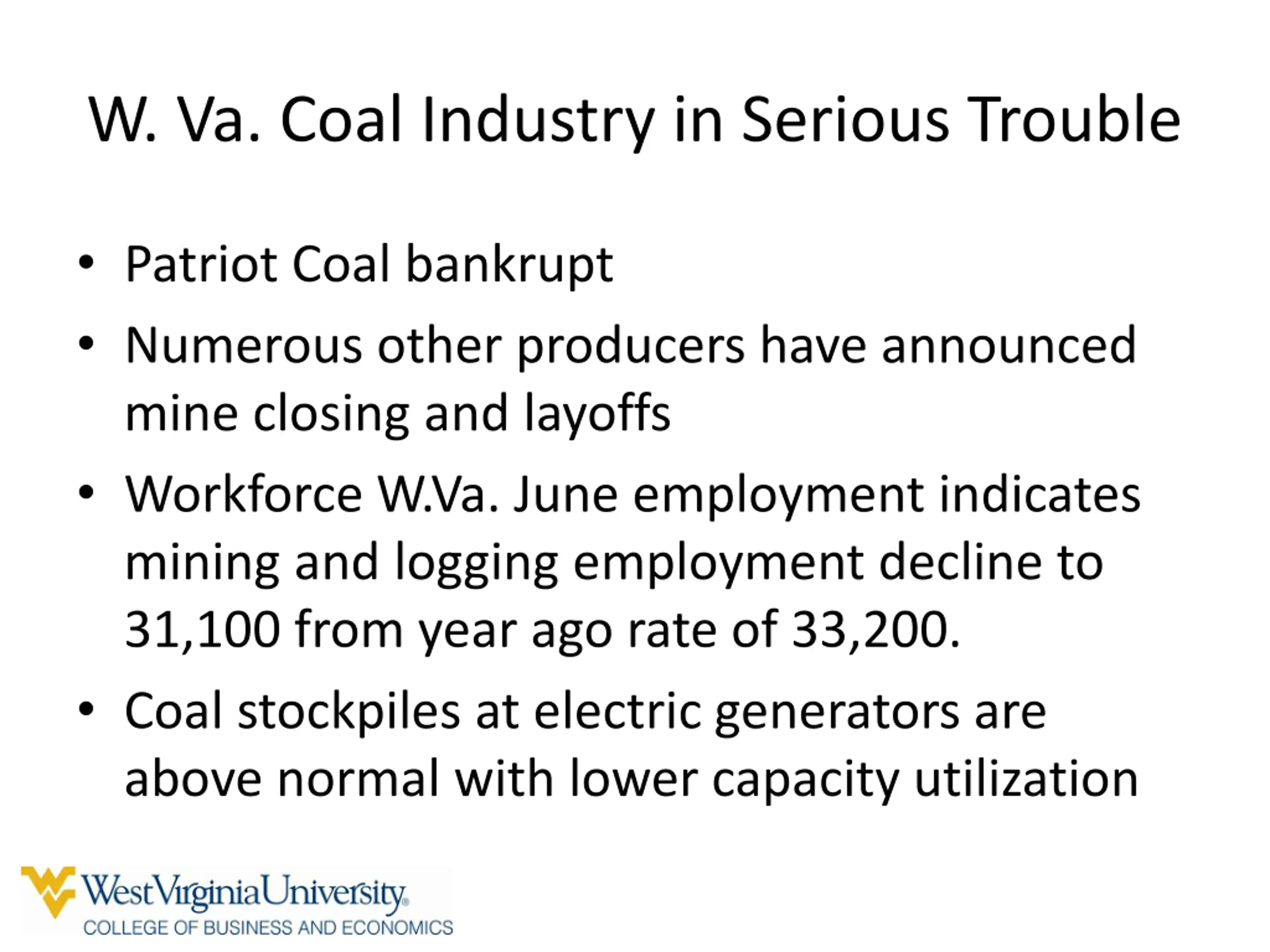 W. Va. Coal Industry in Serious Trouble Patriot Coal bankrupt Numerous other producers have announced mine closing and layoffs Workforce W.Va. June employment indicates mining and logging employment decline to 31,100 from year ago rate of 33,200. Coal stockpiles at electric generators are above normal with lower capacity utilization