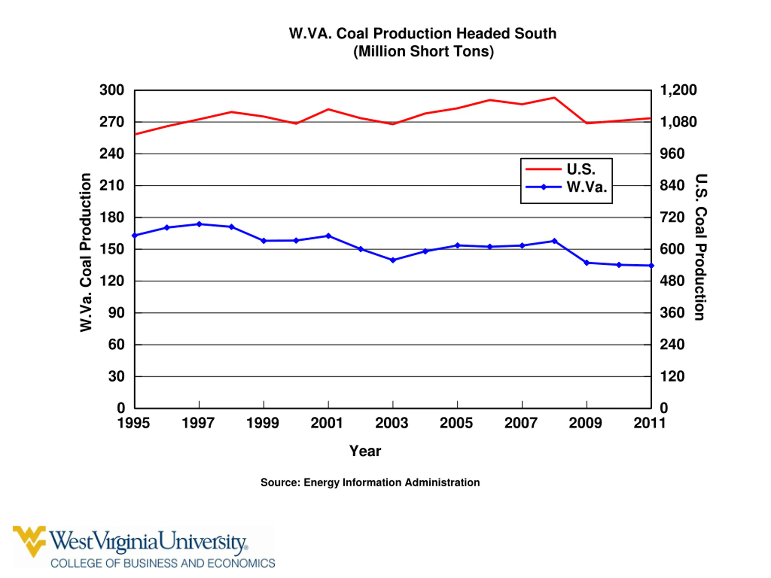 W.VA. Coal Production Headed South (Million Short Tons) 300 1,200 270 1,080 240 960 U.S. W.Va. W.Va. Coal Production U.S. Coal Production 210 840 180 720 150 600 120 480 90 360 60 240 30 120 0 0 1995 1997 1999 2001 2003 2005 2007 2009 2011 Year Source: Energy Information Administration