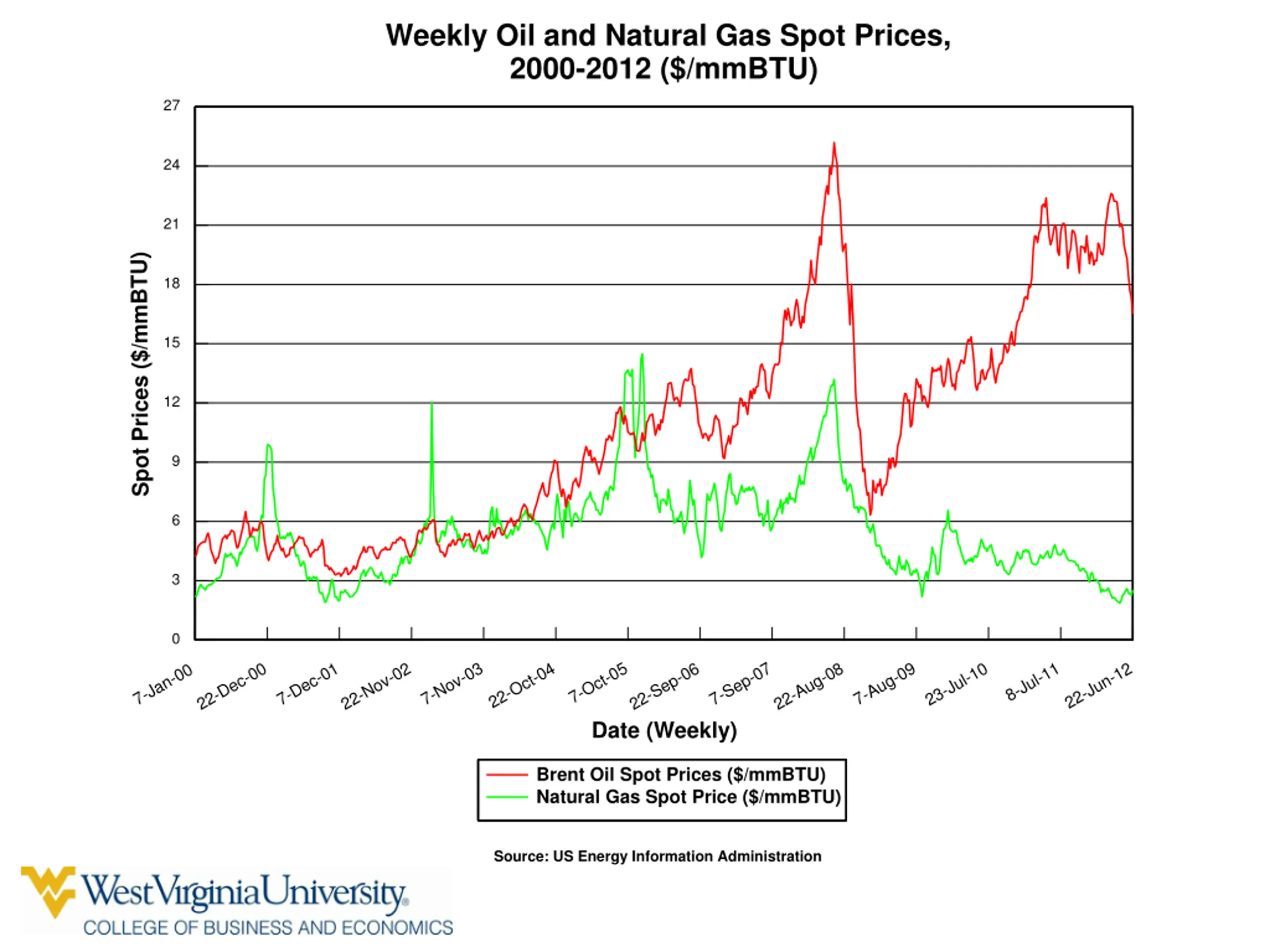 Weekly Oil and Natural Gas Spot Prices, 2000-2012 ($/mmBTU) 27 24 21 Spot Prices ($/mmBTU) 18 15 12 9 6 3 0 7-Oct-05 Date (Weekly) 7-Sep-07 7-Aug-09 8-Jul-11 7-Nov-03 22-Oct-04 7-Dec-01 23-Jul-10 22-Dec-00 22-Nov-02 22-Sep-06 22-Aug-08 22-Jun-12 7-Jan-00 Brent Oil Spot Prices ($/mmBTU) Natural Gas Spot Price ($/mmBTU) Source: US Energy Information Administration
