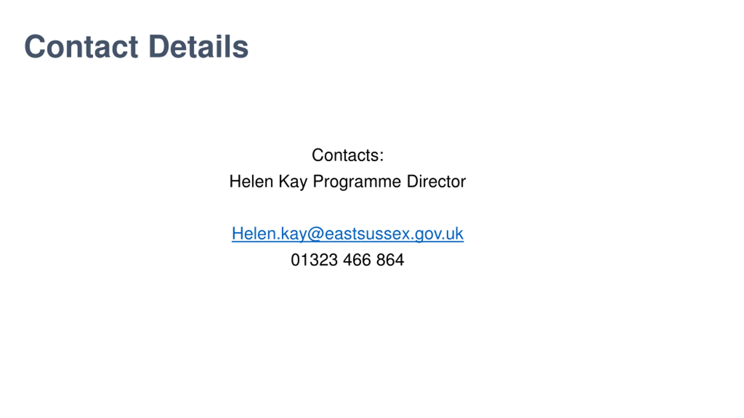 Contact Details Contacts: Helen Kay Programme Director Helen.kay@eastsussex.gov.uk 01323 466 864