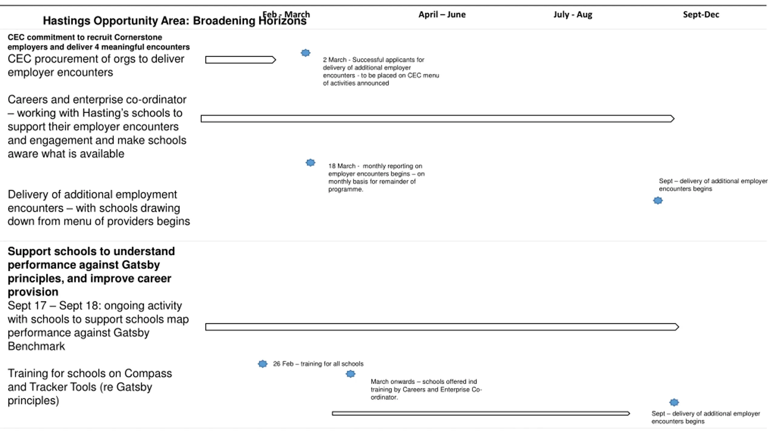 Feb - March April June July - Aug Sept-Dec Hastings Opportunity Area: Broadening Horizons CEC commitment to recruit Cornerstone employers and deliver 4 meaningful encounters CEC procurement of orgs to deliver employer encounters 2 March - Successful applicants for delivery of additional employer encounters - to be placed on CEC menu of activities announced Careers and enterprise co-ordinator working with Hasting s schools to support their employer encounters and engagement and make schools aware what is available 18 March - monthly reporting on employer encounters begins on monthly basis for remainder of programme. Sept delivery of additional employer encounters begins Delivery of additional employment encounters with schools drawing down from menu of providers begins Support schools to understand performance against Gatsby principles, and improve career provision Sept 17 Sept 18: ongoing activity with schools to support schools map performance against Gatsby Benchmark 26 Feb training for all schools Training for schools on Compass and Tracker Tools (re Gatsby principles) March onwards schools offered ind training by Careers and Enterprise Co- ordinator. Sept delivery of additional employer encounters begins