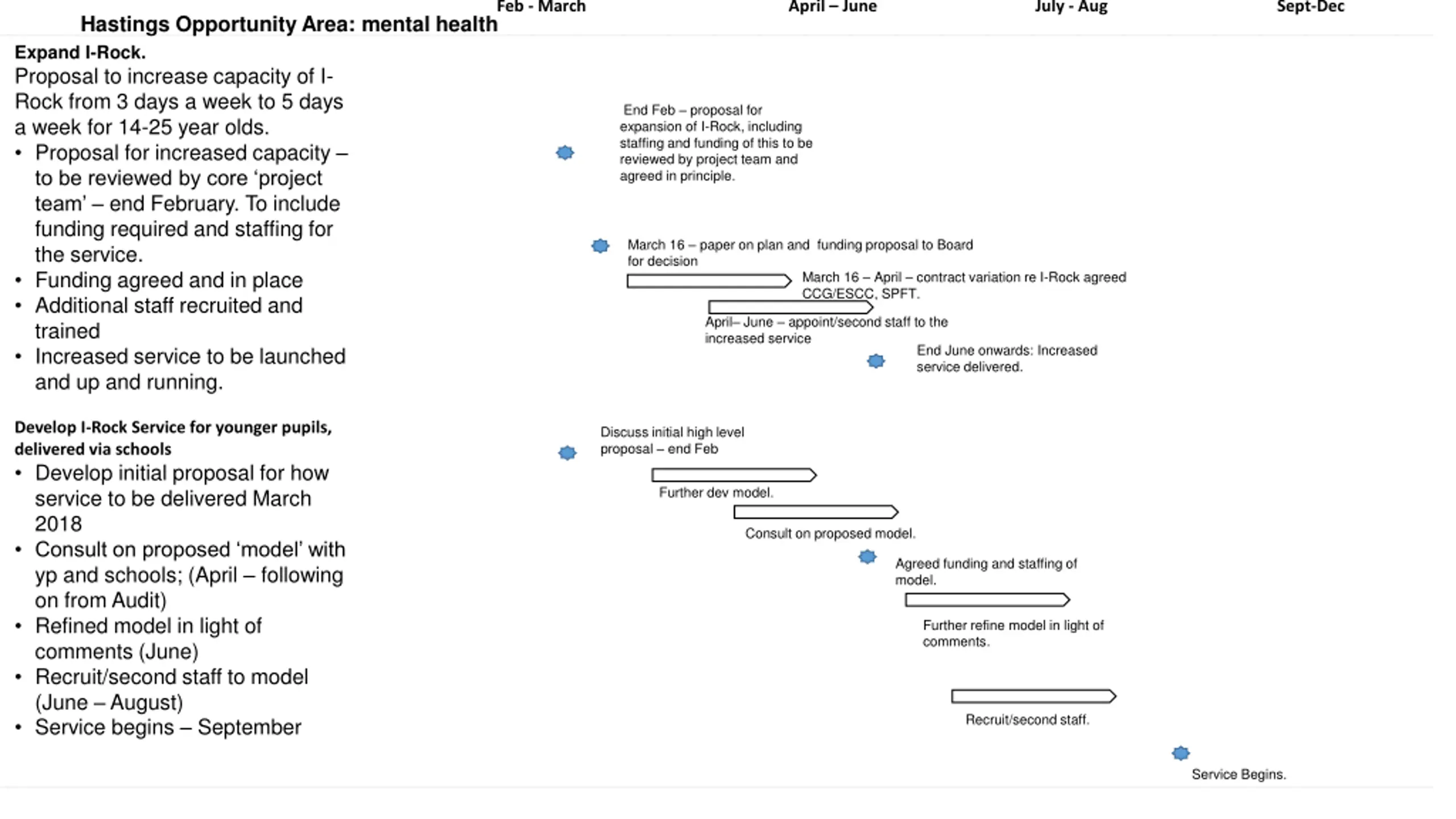Feb - March April June July - Aug Sept-Dec Hastings Opportunity Area: mental health Expand I-Rock. Proposal to increase capacity of I- Rock from 3 days a week to 5 days a week for 14-25 year olds. Proposal for increased capacity to be reviewed by core project team end February. To include funding required and staffing for the service. Funding agreed and in place Additional staff recruited and trained Increased service to be launched and up and running. End Feb proposal for expansion of I-Rock, including staffing and funding of this to be reviewed by project team and agreed in principle. March 16 paper on plan and funding proposal to Board for decision March 16 April contract variation re I-Rock agreed CCG/ESCC, SPFT. April June appoint/second staff to the increased service End June onwards: Increased service delivered. Develop I-Rock Service for younger pupils, delivered via schools Develop initial proposal for how service to be delivered March 2018 Consult on proposed model with yp and schools; (April following on from Audit) Refined model in light of comments (June) Recruit/second staff to model (June August) Service begins September Discuss initial high level proposal end Feb Further dev model. Consult on proposed model. Agreed funding and staffing of model. Further refine model in light of comments. Recruit/second staff. Service Begins.