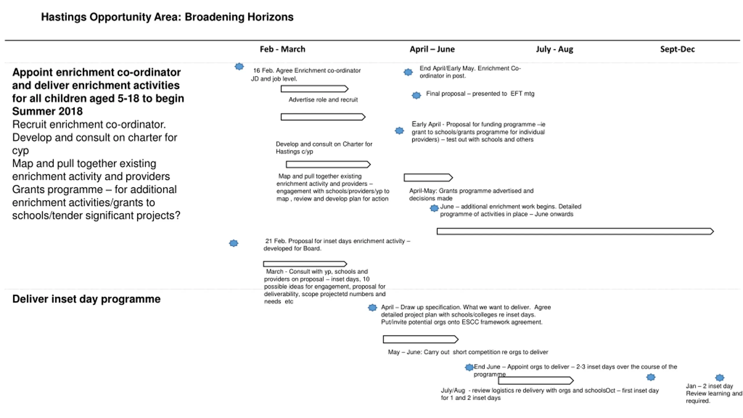 Hastings Opportunity Area: Broadening Horizons Feb - March April June July - Aug Sept-Dec End April/Early May. Enrichment Co- ordinator in post. Appoint enrichment co-ordinator and deliver enrichment activities for all children aged 5-18 to begin Summer 2018 Recruit enrichment co-ordinator. Develop and consult on charter for cyp Map and pull together existing enrichment activity and providers Grants programme for additional enrichment activities/grants to schools/tender significant projects? 16 Feb. Agree Enrichment co-ordinator JD and job level. Final proposal presented to EFT mtg Advertise role and recruit Early April - Proposal for funding programme ie grant to schools/grants programme for individual providers) test out with schools and others Develop and consult on Charter for Hastings c/yp Map and pull together existing enrichment activity and providers engagement with schools/providers/yp to map , review and develop plan for action April-May: Grants programme advertised and decisions made June additional enrichment work begins. Detailed programme of activities in place June onwards 21 Feb. Proposal for inset days enrichment activity developed for Board. March - Consult with yp, schools and providers on proposal inset days, 10 possible ideas for engagement, proposal for deliverability, scope projectetd numbers and needs etc Deliver inset day programme April Draw up specification. What we want to deliver. Agree detailed project plan with schools/colleges re inset days. Put/invite potential orgs onto ESCC framework agreement. May June: Carry out short competition re orgs to deliver End June Appoint orgs to deliver 2-3 inset days over the course of the programme Jan 2 inset day Review learning and re required. July/Aug - review logistics re delivery with orgs and schools for 1 and 2 inset days Oct first inset day