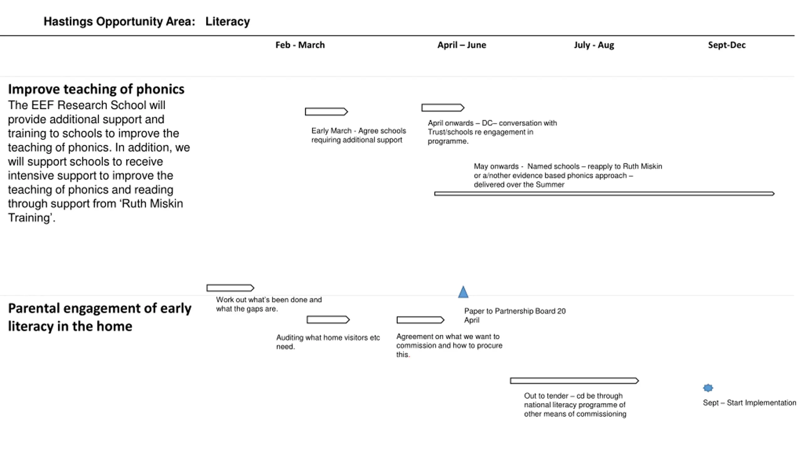 Hastings Opportunity Area: Literacy Feb - March April June July - Aug Sept-Dec Improve teaching of phonics The EEF Research School will provide additional support and training to schools to improve the teaching of phonics. In addition, we will support schools to receive intensive support to improve the teaching of phonics and reading through support from Ruth Miskin Training . April onwards DC conversation with Trust/schools re engagement in programme. Early March - Agree schools requiring additional support May onwards - Named schools reapply to Ruth Miskin or a/nother evidence based phonics approach delivered over the Summer Work out what s been done and what the gaps are. Parental engagement of early literacy in the home Paper to Partnership Board 20 April Agreement on what we want to commission and how to procure this. Auditing what home visitors etc need. Out to tender cd be through national literacy programme of other means of commissioning Sept Start Implementation