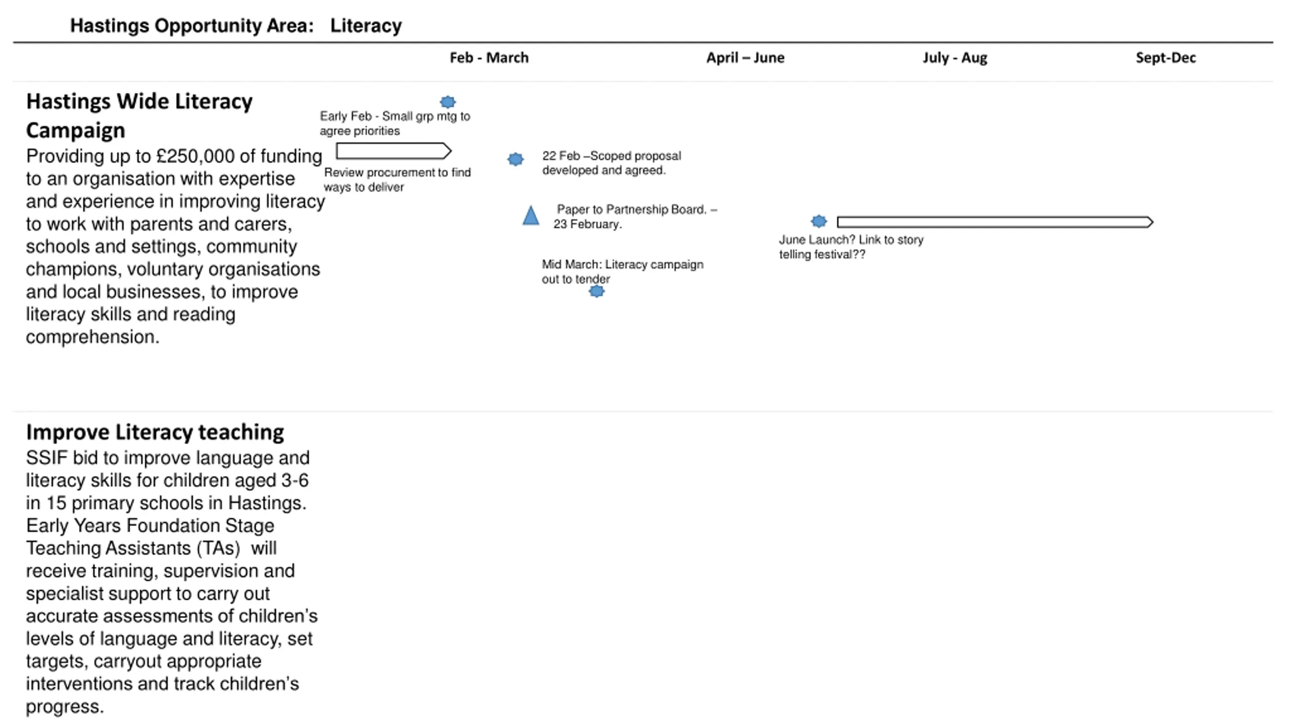 Hastings Opportunity Area: Literacy Feb - March April June July - Aug Sept-Dec Hastings Wide Literacy Campaign Providing up to 250,000 of funding to an organisation with expertise and experience in improving literacy to work with parents and carers, schools and settings, community champions, voluntary organisations and local businesses, to improve literacy skills and reading comprehension. Early Feb - Small grp mtg to agree priorities 22 Feb Scoped proposal developed and agreed. Review procurement to find ways to deliver Paper to Partnership Board. 23 February. June Launch? Link to story telling festival?? Mid March: Literacy campaign out to tender Improve Literacy teaching SSIF bid to improve language and literacy skills for children aged 3-6 in 15 primary schools in Hastings. Early Years Foundation Stage Teaching Assistants (TAs) will receive training, supervision and specialist support to carry out accurate assessments of children s levels of language and literacy, set targets, carryout appropriate interventions and track children s progress.