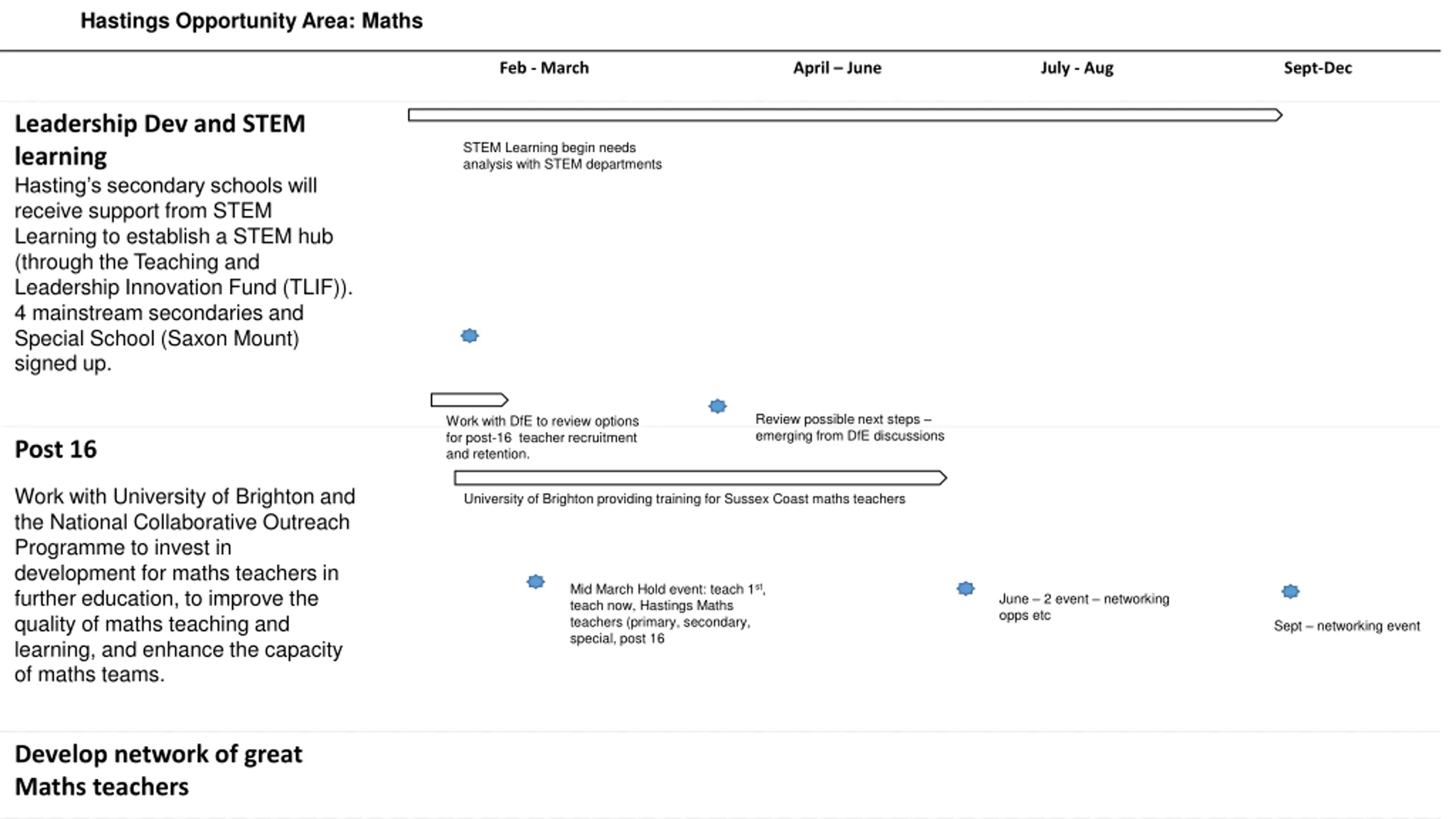 Hastings Opportunity Area: Maths Feb - March April June July - Aug Sept-Dec Leadership Dev and STEM learning Hasting s secondary schools will receive support from STEM Learning to establish a STEM hub (through the Teaching and Leadership Innovation Fund (TLIF)). 4 mainstream secondaries and Special School (Saxon Mount) signed up. STEM Learning begin needs analysis with STEM departments Review possible next steps emerging from DfE discussions Work with DfE to review options for post-16 teacher recruitment and retention. Post 16 Work with University of Brighton and the National Collaborative Outreach Programme to invest in development for maths teachers in further education, to improve the quality of maths teaching and learning, and enhance the capacity of maths teams. University of Brighton providing training for Sussex Coast maths teachers Mid March Hold event: teach 1st, teach now, Hastings Maths teachers (primary, secondary, special, post 16 June 2 event networking opps etc Sept networking event Develop network of great Maths teachers