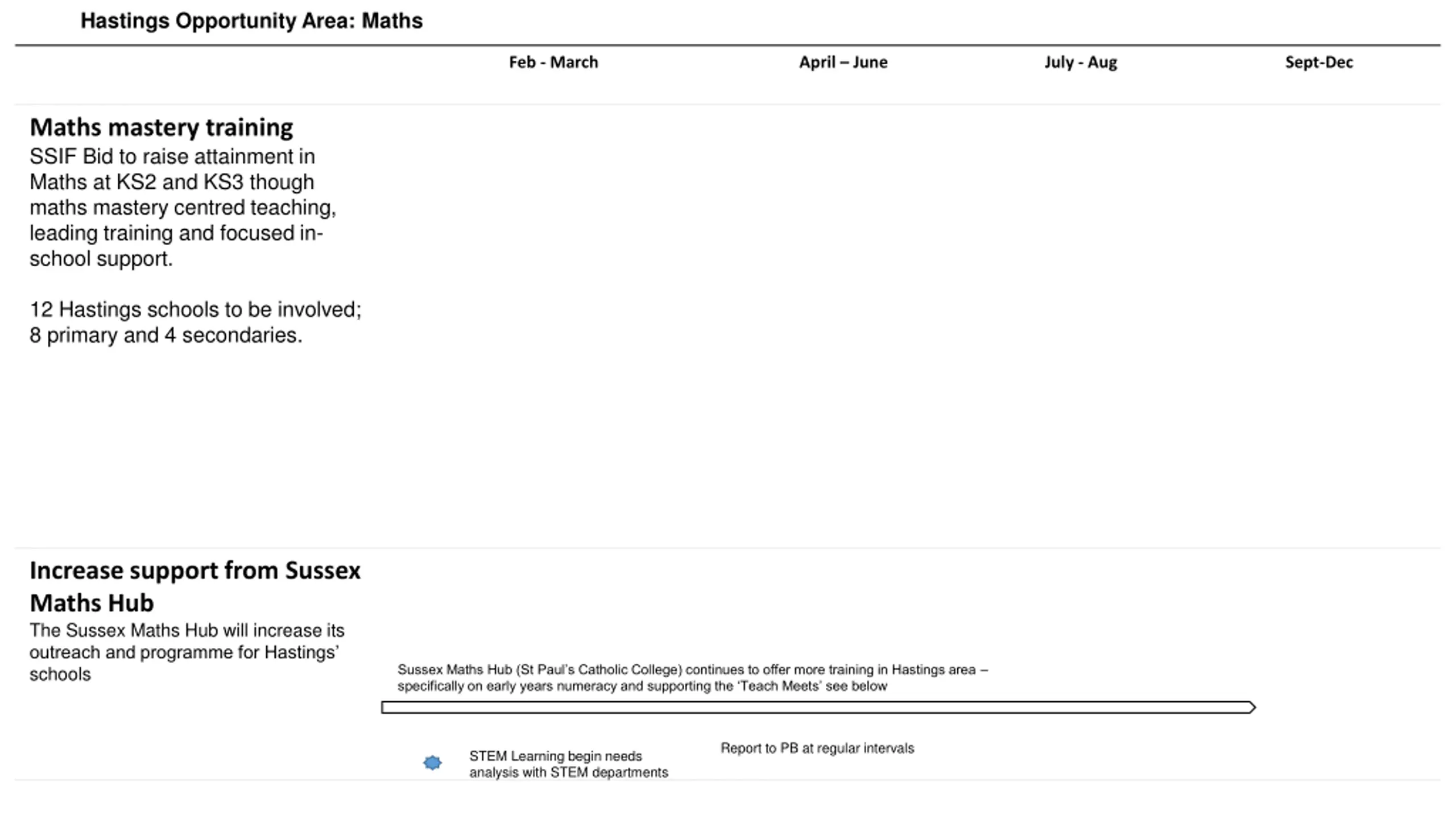 Hastings Opportunity Area: Maths Feb - March April June July - Aug Sept-Dec Maths mastery training SSIF Bid to raise attainment in Maths at KS2 and KS3 though maths mastery centred teaching, leading training and focused in- school support. 12 Hastings schools to be involved; 8 primary and 4 secondaries. Increase support from Sussex Maths Hub The Sussex Maths Hub will increase its outreach and programme for Hastings schools Sussex Maths Hub (St Paul s Catholic College) continues to offer more training in Hastings area specifically on early years numeracy and supporting the Teach Meets see below Report to PB at regular intervals STEM Learning begin needs analysis with STEM departments