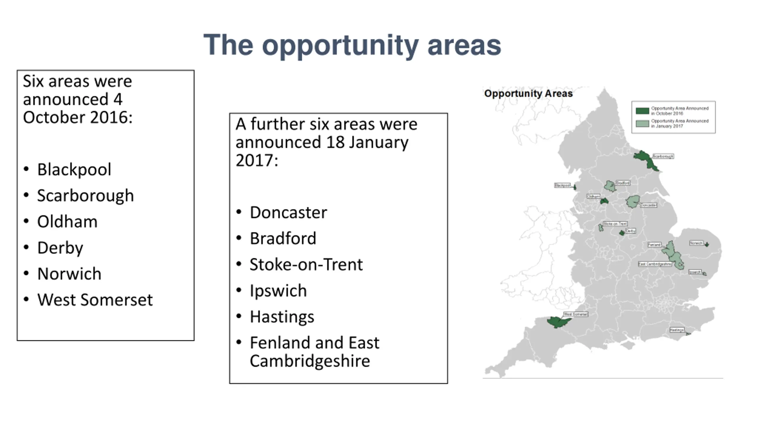 The opportunity areas Six areas were announced 4 October 2016: A further six areas were announced 18 January 2017: Blackpool Scarborough Oldham Derby Norwich West Somerset Doncaster Bradford Stoke-on-Trent Ipswich Hastings Fenland and East Cambridgeshire