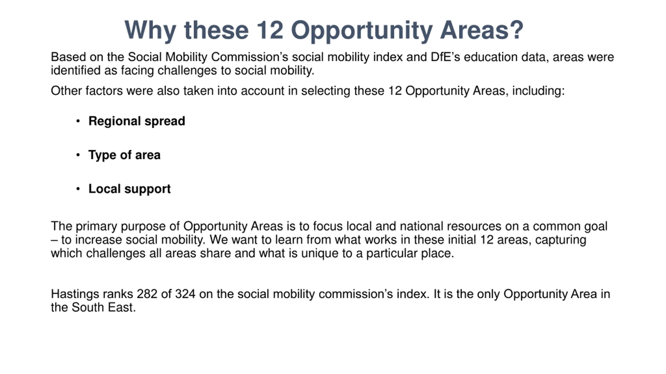 Why these 12 Opportunity Areas? Based on the Social Mobility Commission s social mobility index and DfE s education data, areas were identified as facing challenges to social mobility. Other factors were also taken into account in selecting these 12 Opportunity Areas, including: Regional spread Type of area Local support The primary purpose of Opportunity Areas is to focus local and national resources on a common goal to increase social mobility. We want to learn from what works in these initial 12 areas, capturing which challenges all areas share and what is unique to a particular place. Hastings ranks 282 of 324 on the social mobility commission s index. It is the only Opportunity Area in the South East.