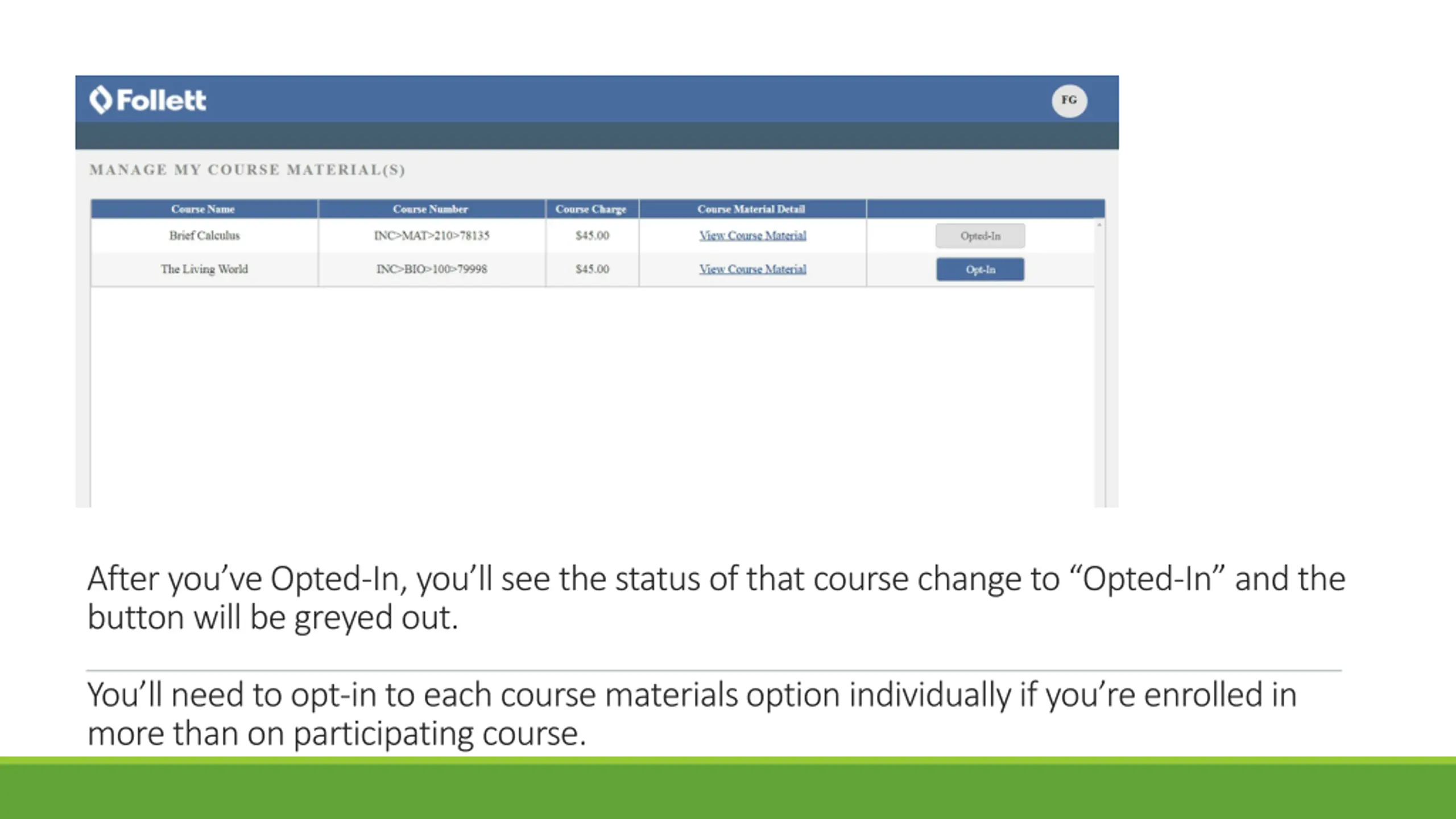 After youve Opted-In, youll see the status of that course change to Opted-In and the button will be greyed out. You ll need to opt-in to each course materials option individually if you re enrolled in more than on participating course.