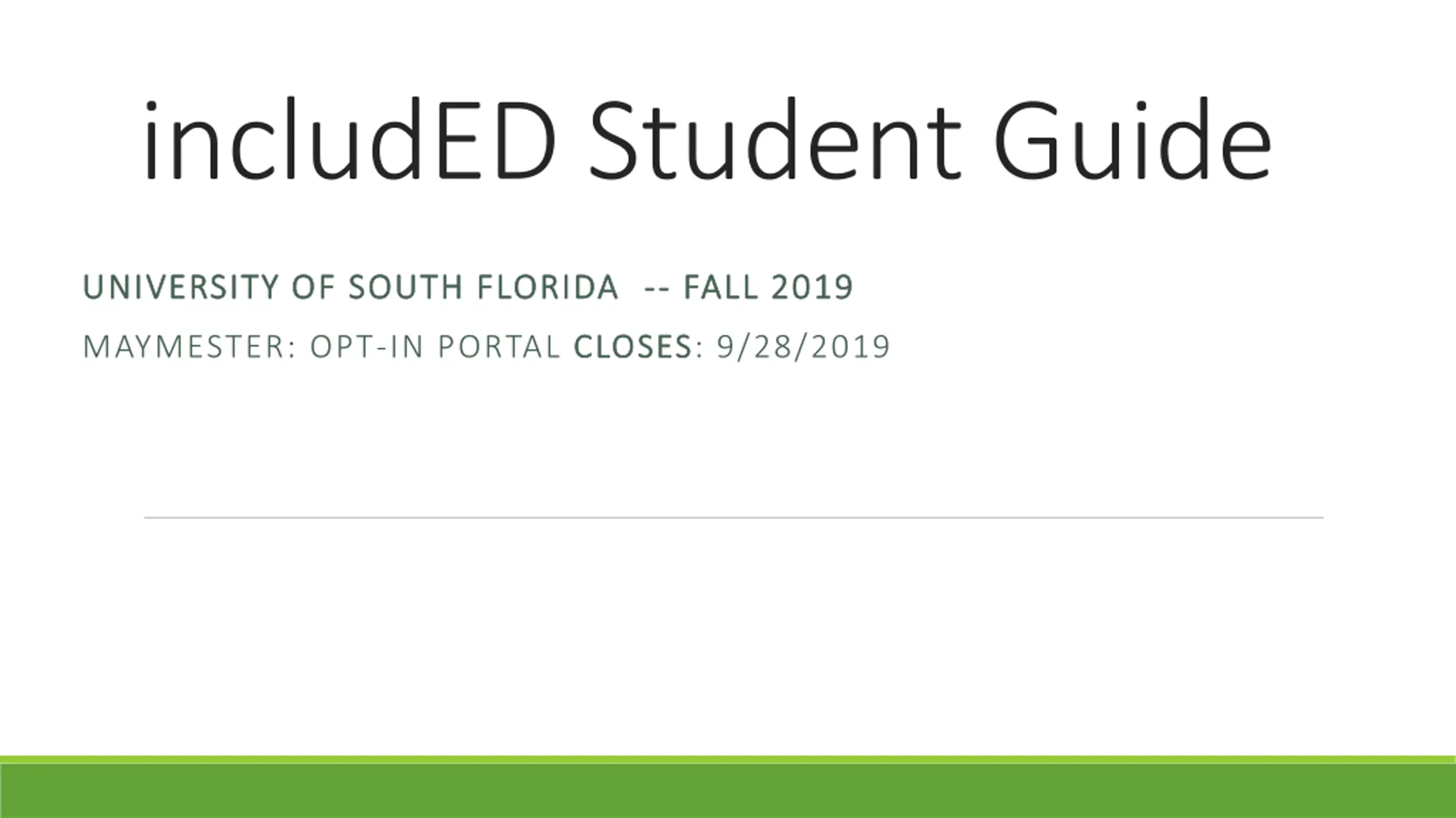 includED Student Guide UNIVERSITY OF SOUTH FLORIDA UNIVERSITY OF SOUTH FLORIDA -- -- FALL 2019 FALL 2019 MAYMESTER: OPT-IN PORTAL CLOSES CLOSES: 9/28/2019