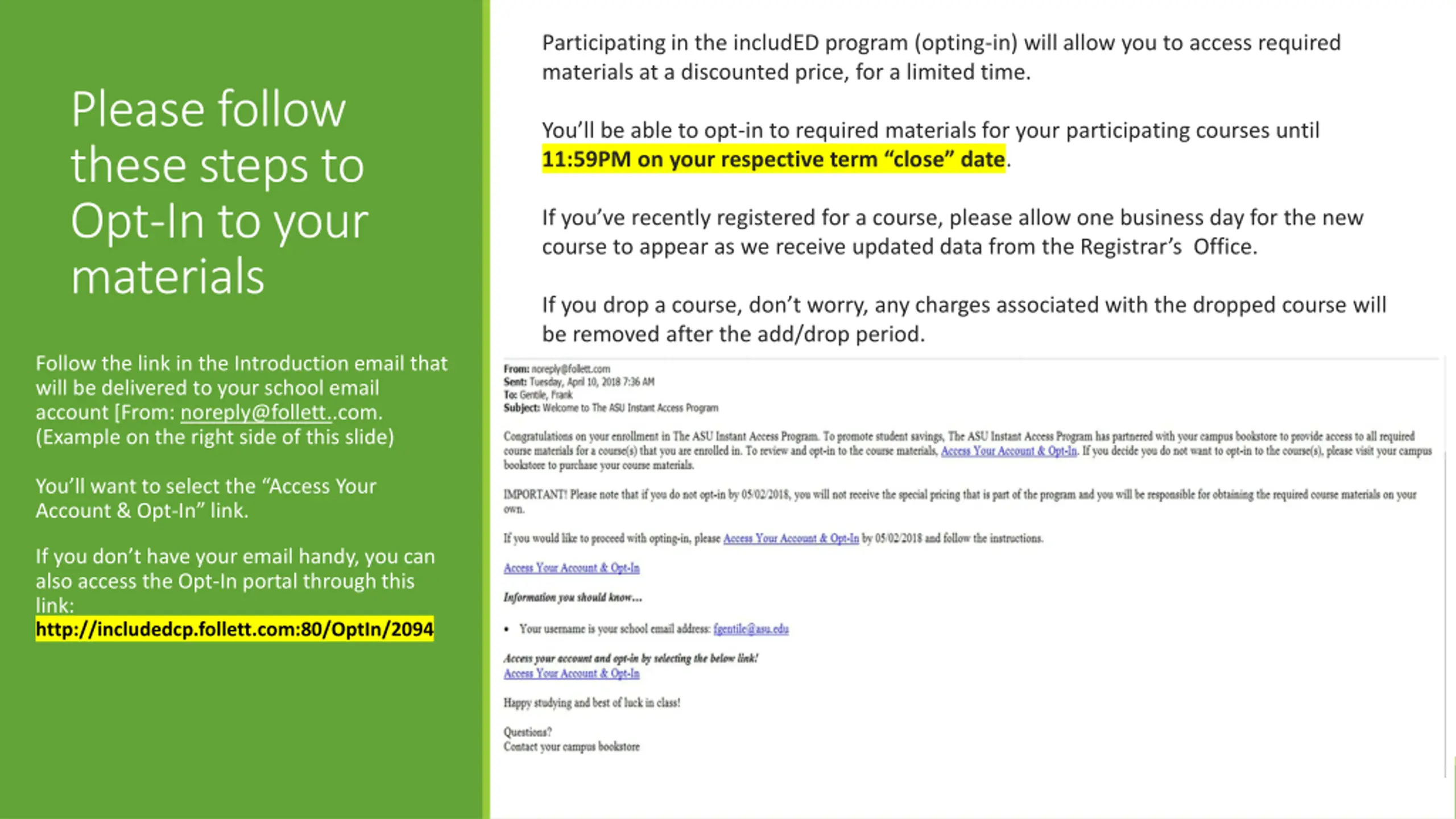 Participating in the includED program (opting-in) will allow you to access required materials at a discounted price, for a limited time. Please follow these steps to Opt-In to your materials You ll be able to opt-in to required materials for your participating courses until 11:59PM on your respective term close date. If you ve recently registered for a course, please allow one business day for the new course to appear as we receive updated data from the Registrar s Office. If you drop a course, don t worry, any charges associated with the dropped course will be removed after the add/drop period. Follow the link in the Introduction email that will be delivered to your school email account [From: noreply@follett..com. (Example on the right side of this slide) You ll want to select the Access Your Account & Opt-In link. If you don t have your email handy, you can also access the Opt-In portal through this link: http://includedcp.follett.com:80/OptIn/2094