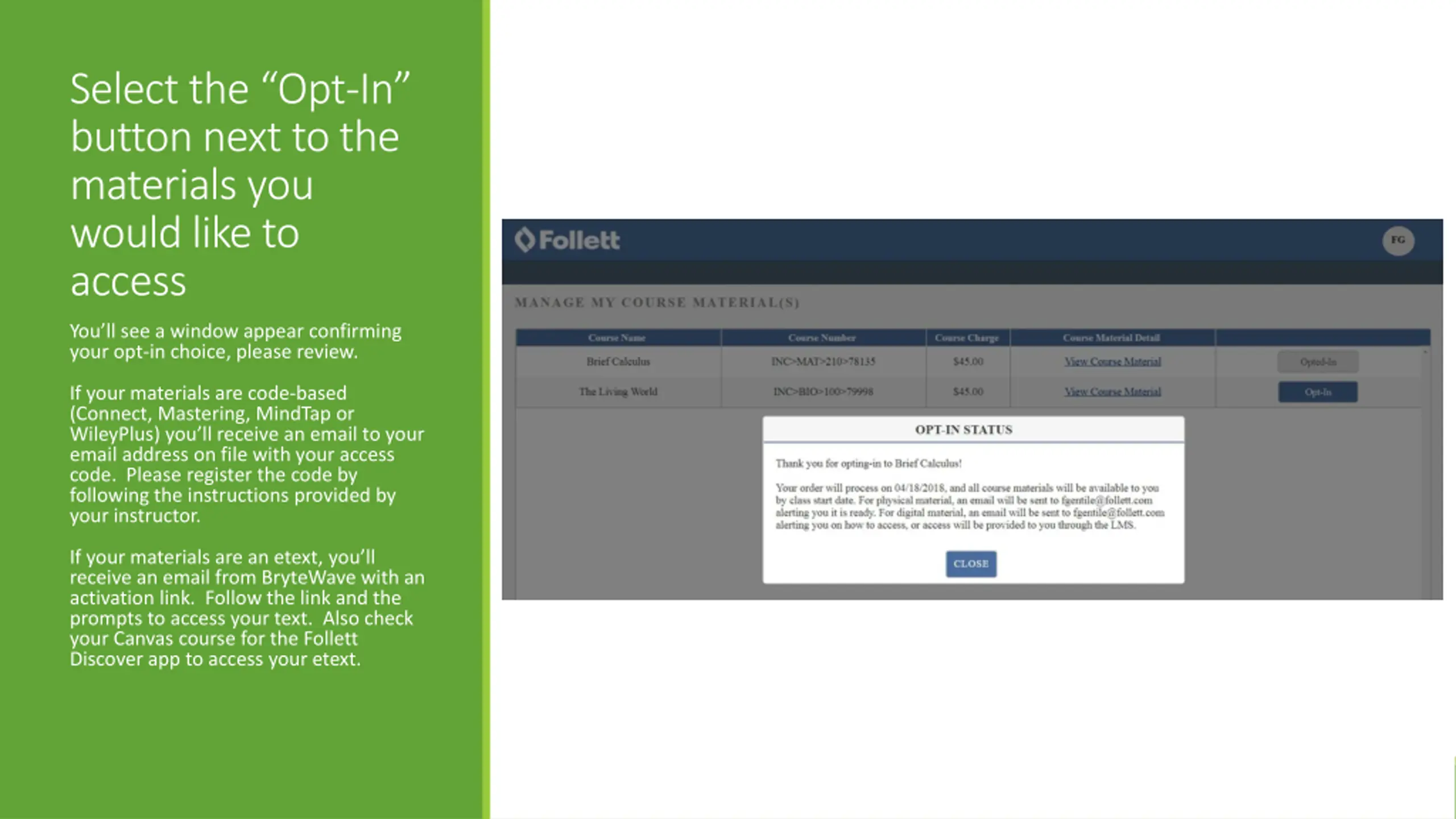 Select the Opt-In button next to the materials you would like to access You ll see a window appear confirming your opt-in choice, please review. If your materials are code-based (Connect, Mastering, MindTap or WileyPlus) you ll receive an email to your email address on file with your access code. Please register the code by following the instructions provided by your instructor. If your materials are an etext, you ll receive an email from BryteWave with an activation link. Follow the link and the prompts to access your text. Also check your Canvas course for the Follett Discover app to access your etext.