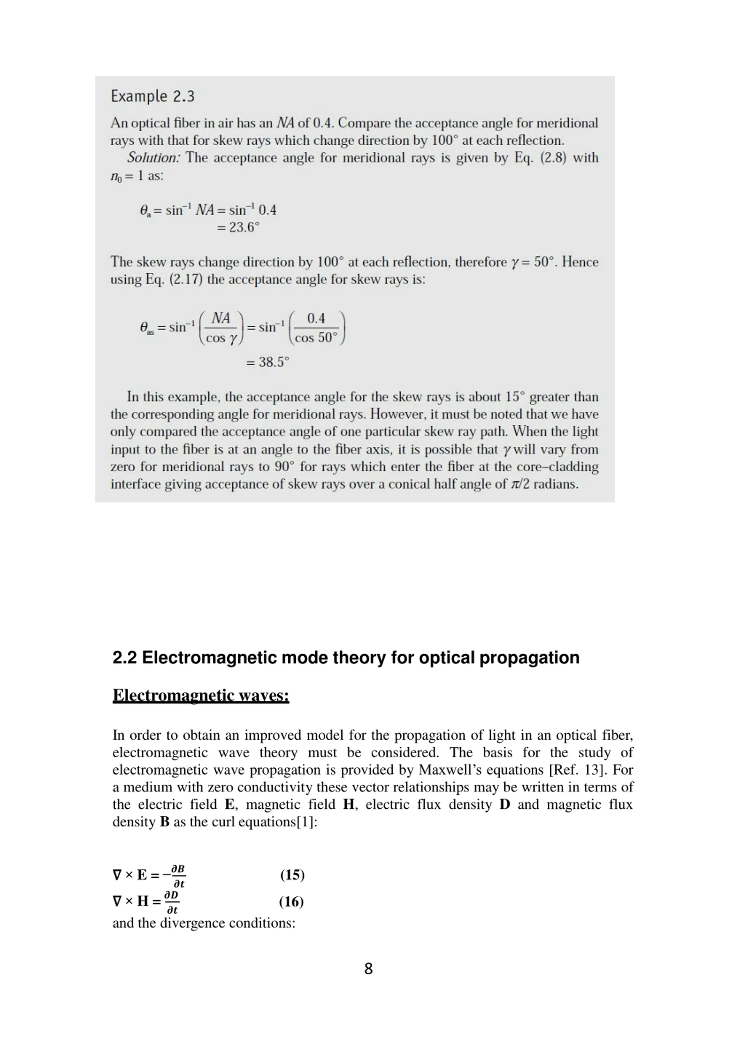 2.2 Electromagnetic mode theory for optical propagation Electromagnetic waves: In order to obtain an improved model for the propagation of light in an optical fiber, electromagnetic wave theory must be considered. The basis for the study of electromagnetic wave propagation is provided by Maxwell s equations [Ref. 13]. For a medium with zero conductivity these vector relationships may be written in terms of the electric field E, magnetic field H, electric flux density D and magnetic flux density B as the curl equations[1]: E = ?? H =?? and the divergence conditions: (15) ?? (16) ?? 8