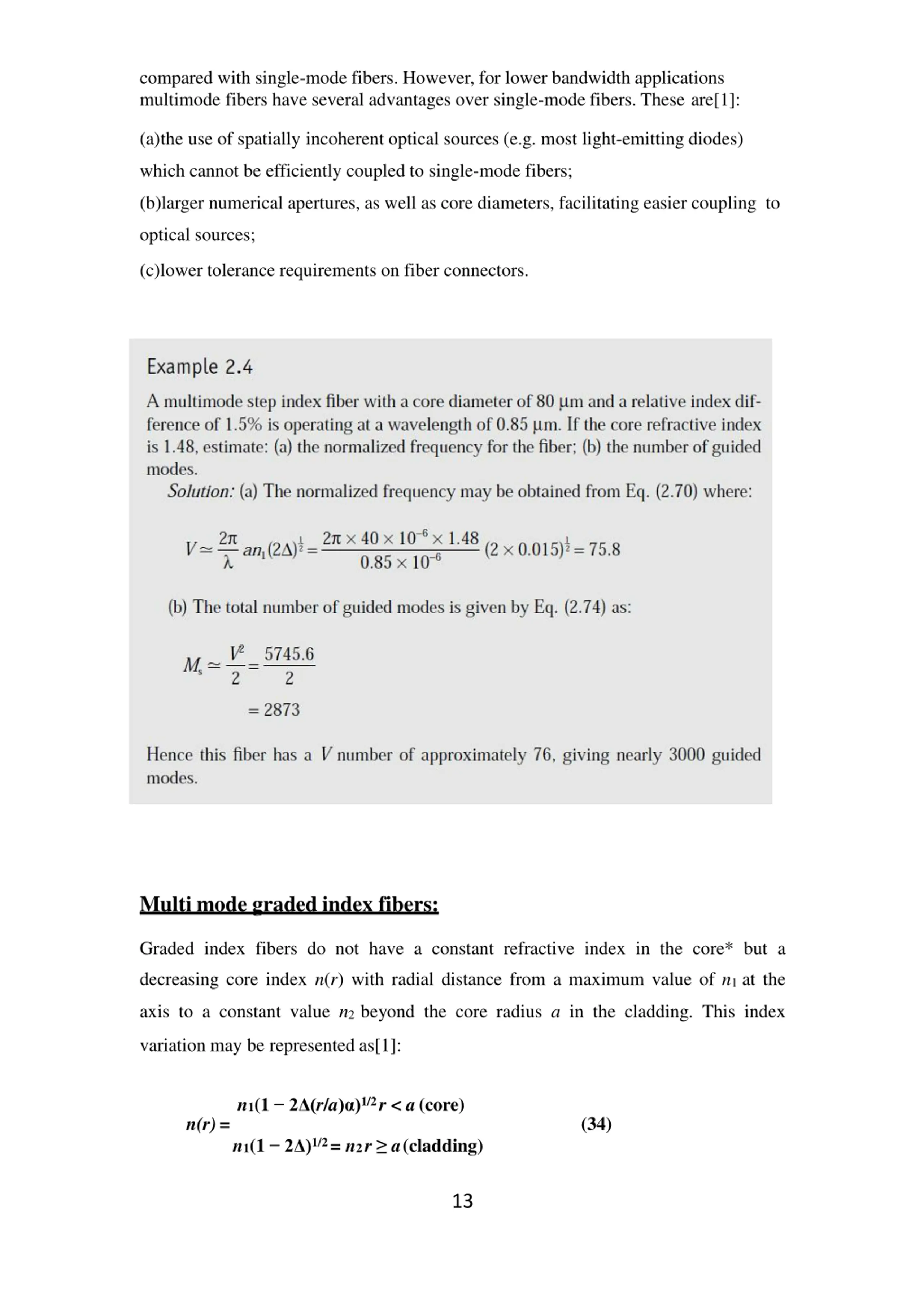 compared with single-mode fibers. However, for lower bandwidth applications multimode fibers have several advantages over single-mode fibers. These are[1]: (a)the use of spatially incoherent optical sources (e.g. most light-emitting diodes) which cannot be efficiently coupled to single-mode fibers; (b)larger numerical apertures, as well as core diameters, facilitating easier coupling to optical sources; (c)lower tolerance requirements on fiber connectors. Multi mode graded index fibers: Graded index fibers do not have a constant refractive index in the core* but a decreasing core index n(r) with radial distance from a maximum value of n1 at the axis to a constant value n2 beyond the core radius a in the cladding. This index variation may be represented as[1]: n1(1 2 (r/a) )1/2 r < a(core) n(r)= (34) n1(1 2 )1/2 = n2 r a(cladding) 13