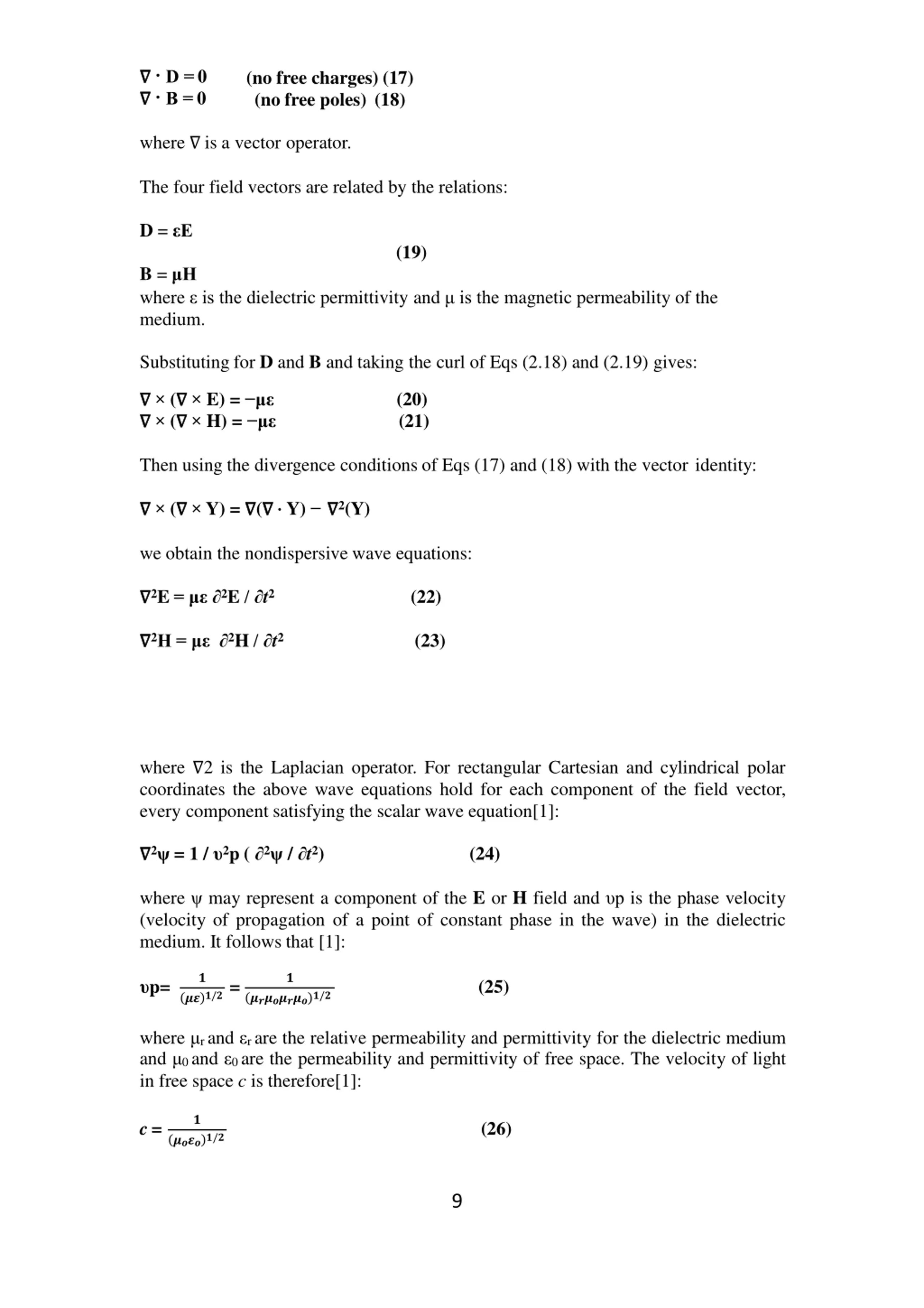 D =0 B =0 (no free charges) (17) (no free poles) (18) where is a vector operator. The four field vectors are related by the relations: D = E (19) B = H where is the dielectric permittivity and is the magnetic permeability of the medium. Substituting for D and B and taking the curl of Eqs (2.18) and (2.19) gives: ( E) = ( H) = (20) (21) Then using the divergence conditions of Eqs (17) and (18) with the vector identity: ( Y) = ( Y) 2(Y) we obtain the nondispersive wave equations: 2E = 2E / t2 (22) 2H = 2H / t2 (23) where 2 is the Laplacian operator. For rectangular Cartesian and cylindrical polar coordinates the above wave equations hold for each component of the field vector, every component satisfying the scalar wave equation[1]: 2 = 1 / 2p ( 2 / t2) (24) where may represent a component of the E or H field and p is the phase velocity (velocity of propagation of a point of constant phase in the wave) in the dielectric medium. It follows that [1]: ? ? p= = (25) (??)?/? (????????)?/? where rand rare the relative permeability and permittivity for the dielectric medium and 0and 0are the permeability and permittivity of free space. The velocity of light in free space c is therefore[1]: ? c= (26) (????)?/? 9