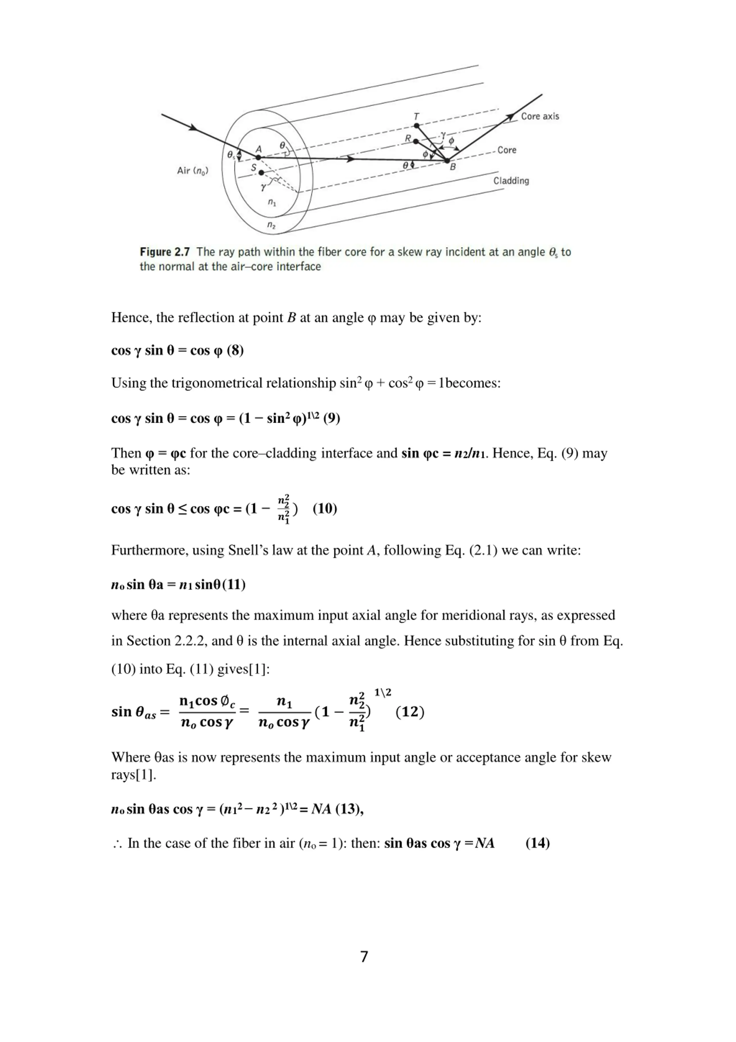 Hence, the reflection at point B at an angle may be given by: cos sin = cos (8) Using the trigonometrical relationship sin2 + cos2 =1becomes: cos sin = cos = (1 sin2 )1\2(9) Then = c for the core cladding interface and sin c = n2/n1. Hence, Eq. (9) may be written as: ?? ?? cos sin cos c = (1 (10) ?) ? Furthermore, using Snell s law at the point A, following Eq. (2.1) we can write: no sin a = n1 sin (11) where a represents the maximum input axial angle for meridional rays, as expressed in Section 2.2.2, and is the internal axial angle. Hence substituting for sin from Eq. (10) into Eq. (11) gives[1]: ?\? ??????(? ?? ? ??? ?????? ?? ?= ? ?) ??? ???= (??) ?? ? Where as is now represents the maximum input angle or acceptance angle for skew rays[1]. no sin as cos = (n12 n2 2 )1\2 = NA(13), In the case of the fiber in air (no = 1): then: sin as cos =NA (14) 7