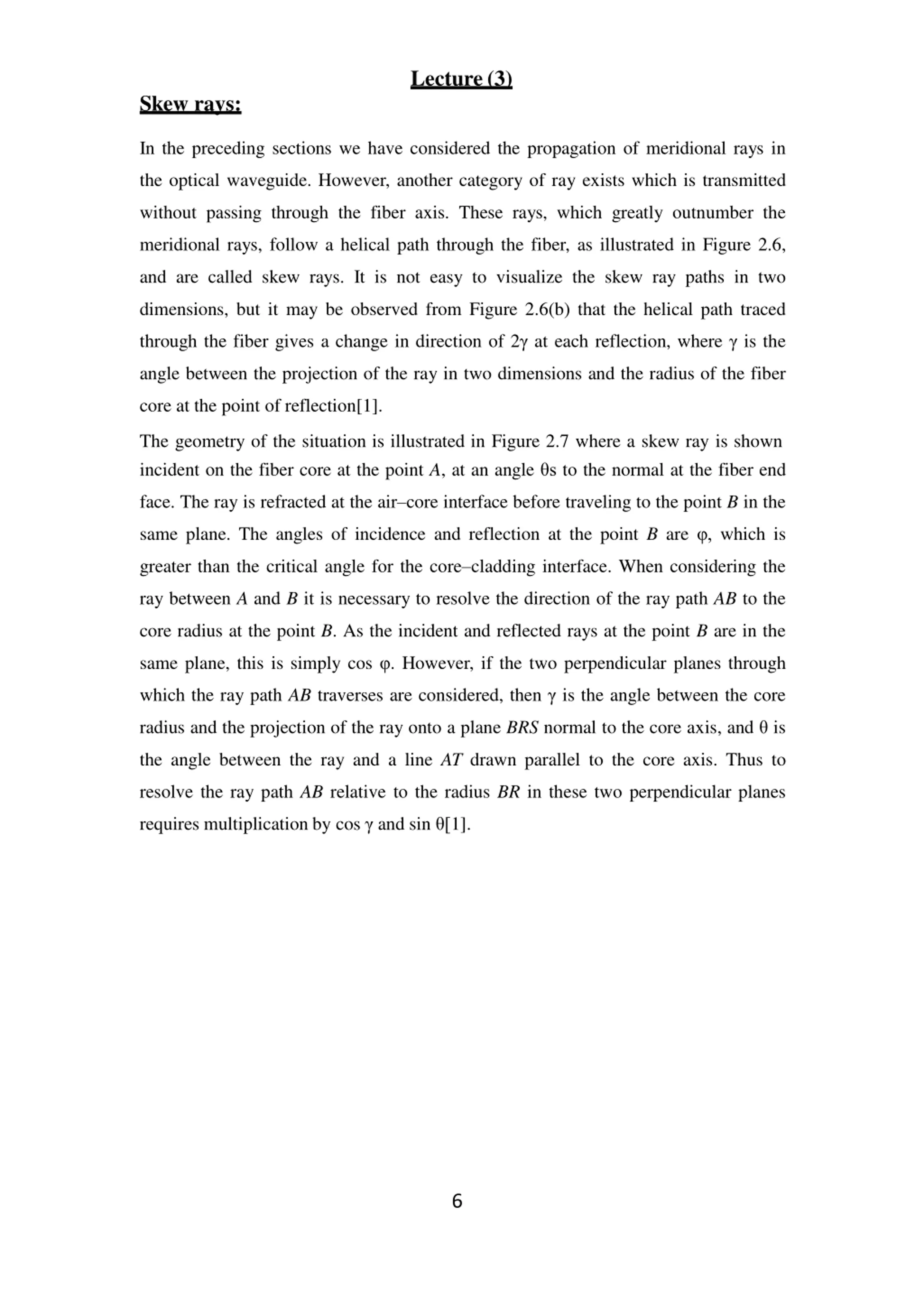 Lecture(3) Skew rays: In the preceding sections we have considered the propagation of meridional rays in the optical waveguide. However, another category of ray exists which is transmitted without passing through the fiber axis. These rays, which greatly outnumber the meridional rays, follow a helical path through the fiber, as illustrated in Figure 2.6, and are called skew rays. It is not easy to visualize the skew ray paths in two dimensions, but it may be observed from Figure 2.6(b) that the helical path traced through the fiber gives a change in direction of 2 at each reflection, where is the angle between the projection of the ray in two dimensions and the radius of the fiber core at the point of reflection[1]. The geometry of the situation is illustrated in Figure 2.7 where a skew ray is shown incident on the fiber core at the point A, at an angle s to the normal at the fiber end face. The ray is refracted at the air core interface before traveling to the point B in the same plane. The angles of incidence and reflection at the point B are , which is greater than the critical angle for the core cladding interface. When considering the ray between A and B it is necessary to resolve the direction of the ray path AB to the core radius at the point B. As the incident and reflected rays at the point B are in the same plane, this is simply cos . However, if the two perpendicular planes through which the ray path AB traverses are considered, then is the angle between the core radius and the projection of the ray onto a plane BRS normal to the core axis, and is the angle between the ray and a line AT drawn parallel to the core axis. Thus to resolve the ray path AB relative to the radius BR in these two perpendicular planes requires multiplication by cos and sin [1]. 6