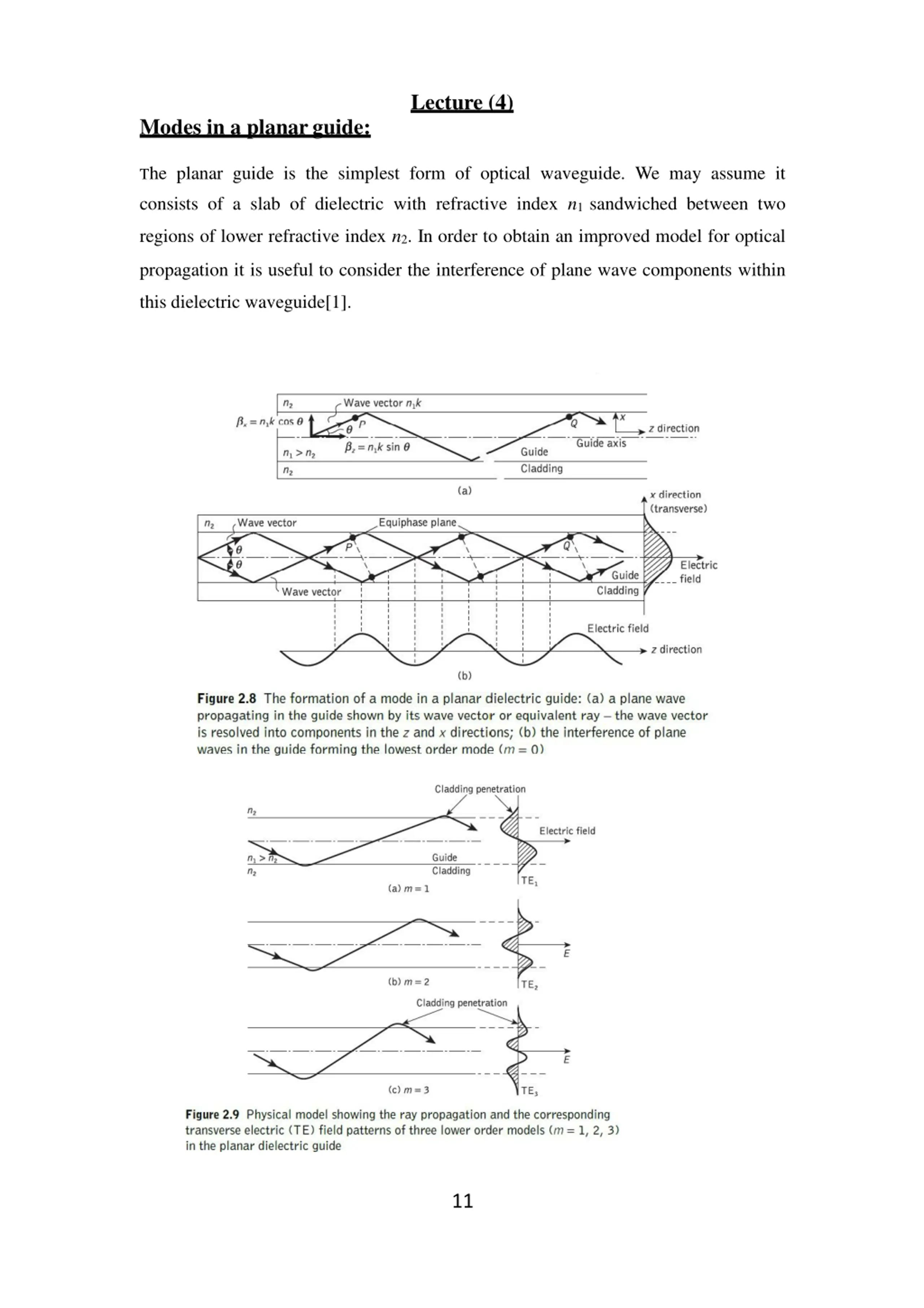 Lecture (4) Modes in a planarguide: The planar guide is the simplest form of optical waveguide. We may assume it consists of a slab of dielectric with refractive index n1 sandwiched between two regions of lower refractive index n2. In order to obtain an improved model for optical propagation it is useful to consider the interference of plane wave components within this dielectric waveguide[1]. 11