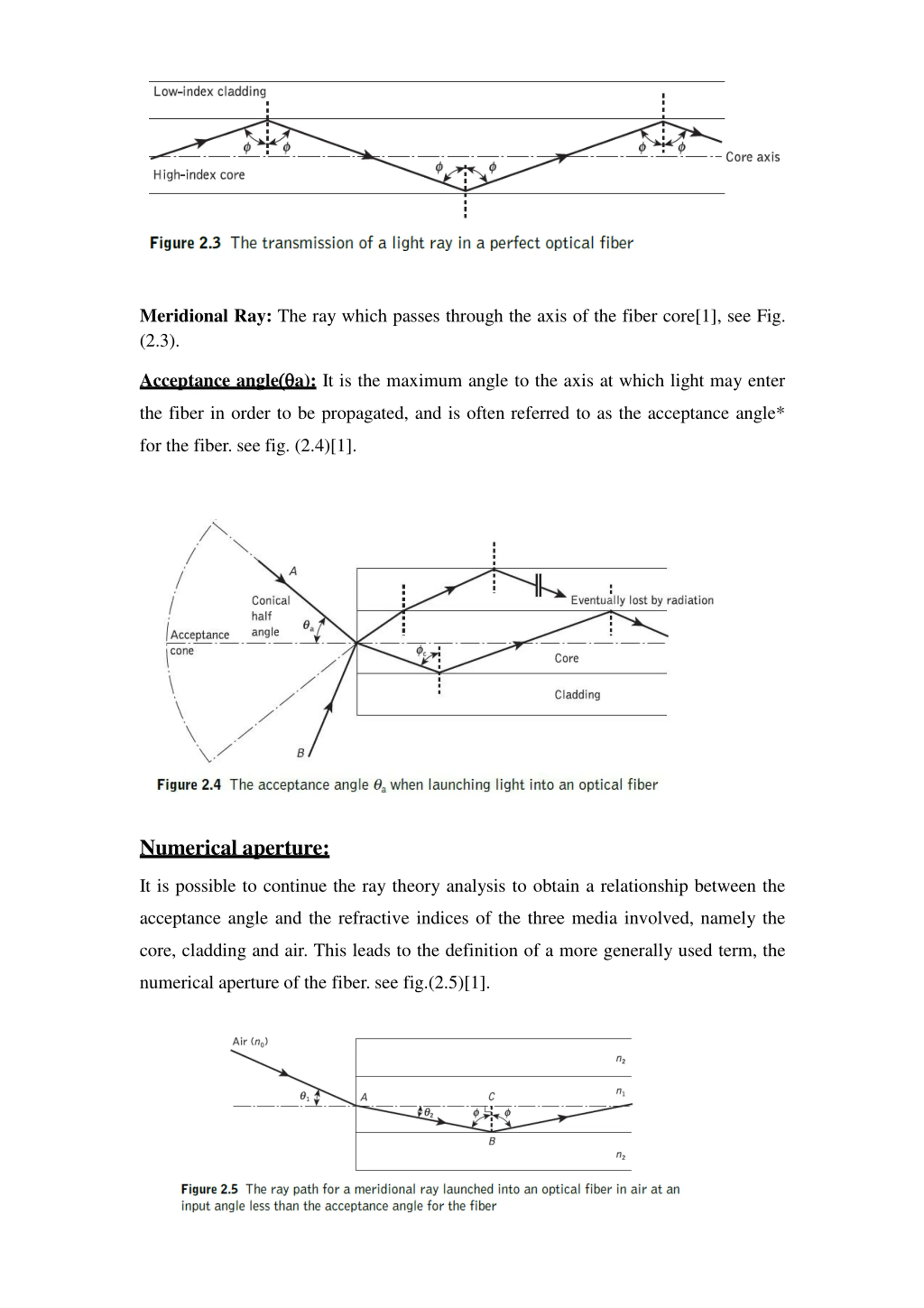 Meridional Ray: The ray which passes through the axis of the fiber core[1], see Fig. (2.3). Acceptance angle( ( a): It is the maximum angle to the axis at which light may enter the fiber in order to be propagated, and is often referred to as the acceptance angle* for the fiber. see fig. (2.4)[1]. Numerical aperture: It is possible to continue the ray theory analysis to obtain a relationship between the acceptance angle and the refractive indices of the three media involved, namely the core, cladding and air. This leads to the definition of a more generally used term, the numerical aperture of the fiber. see fig.(2.5)[1]. 3