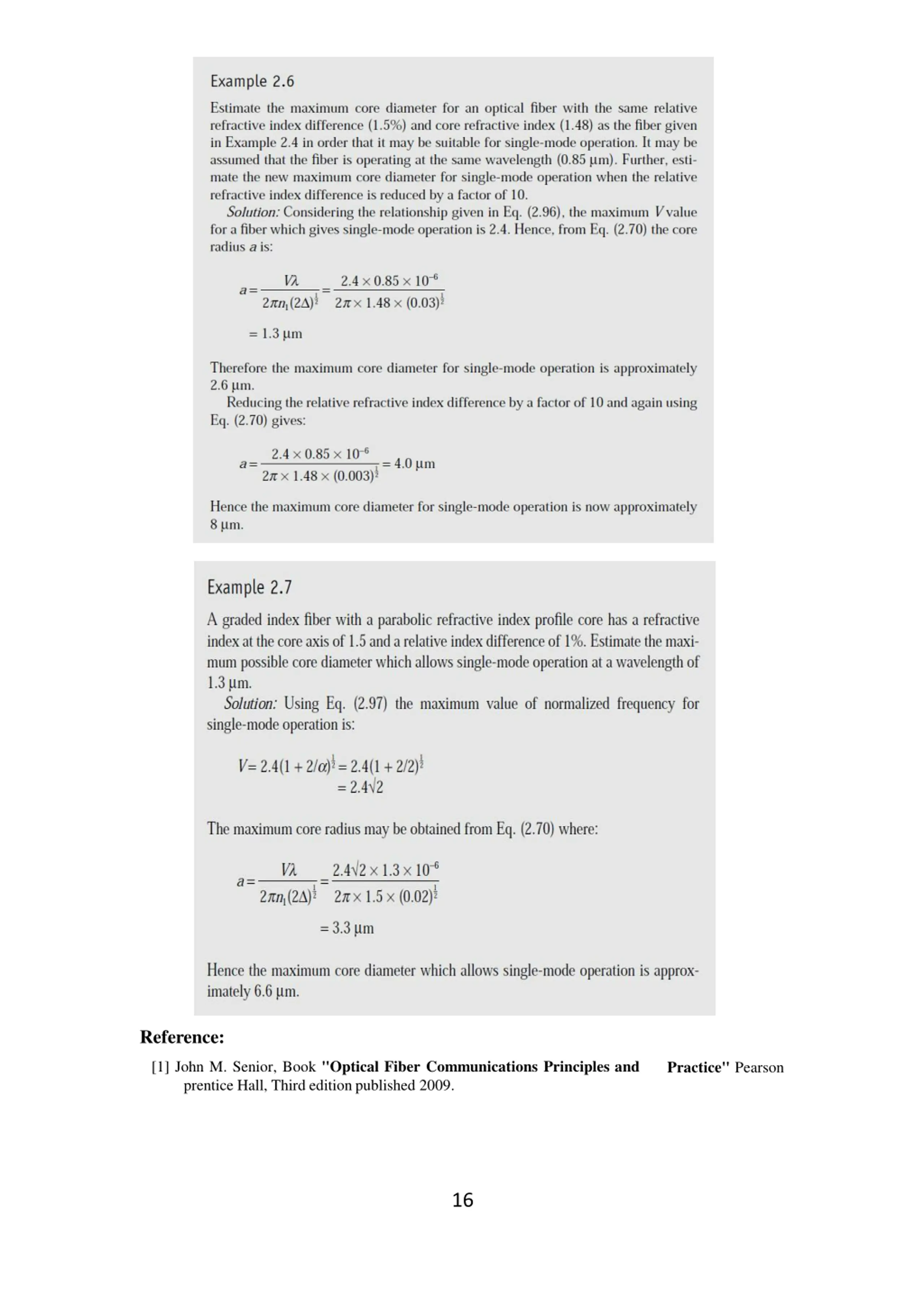Reference: [1] John M. Senior, Book "Optical Fiber Communications Principles and prentice Hall, Third edition published 2009. Practice" Pearson 16