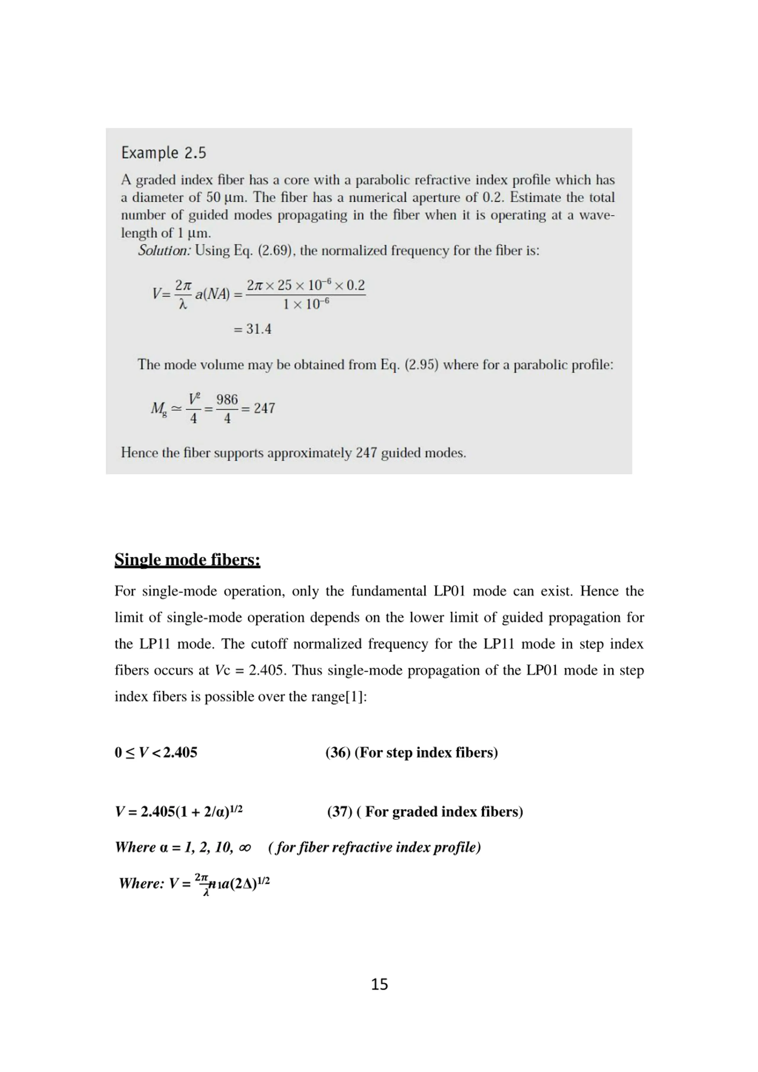 Single mode fibers: For single-mode operation, only the fundamental LP01 mode can exist. Hence the limit of single-mode operation depends on the lower limit of guided propagation for the LP11 mode. The cutoff normalized frequency for the LP11 mode in step index fibers occurs at Vc = 2.405. Thus single-mode propagation of the LP01 mode in step index fibers is possible over the range[1]: 0 V <2.405 (36) (For step index fibers) V = 2.405(1 + 2/ )1/2 (37) ( For graded index fibers) Where = 1, 2, 10, ( for fiber refractive index profile) Where: V =??n1a(2 )1/2 ? 15