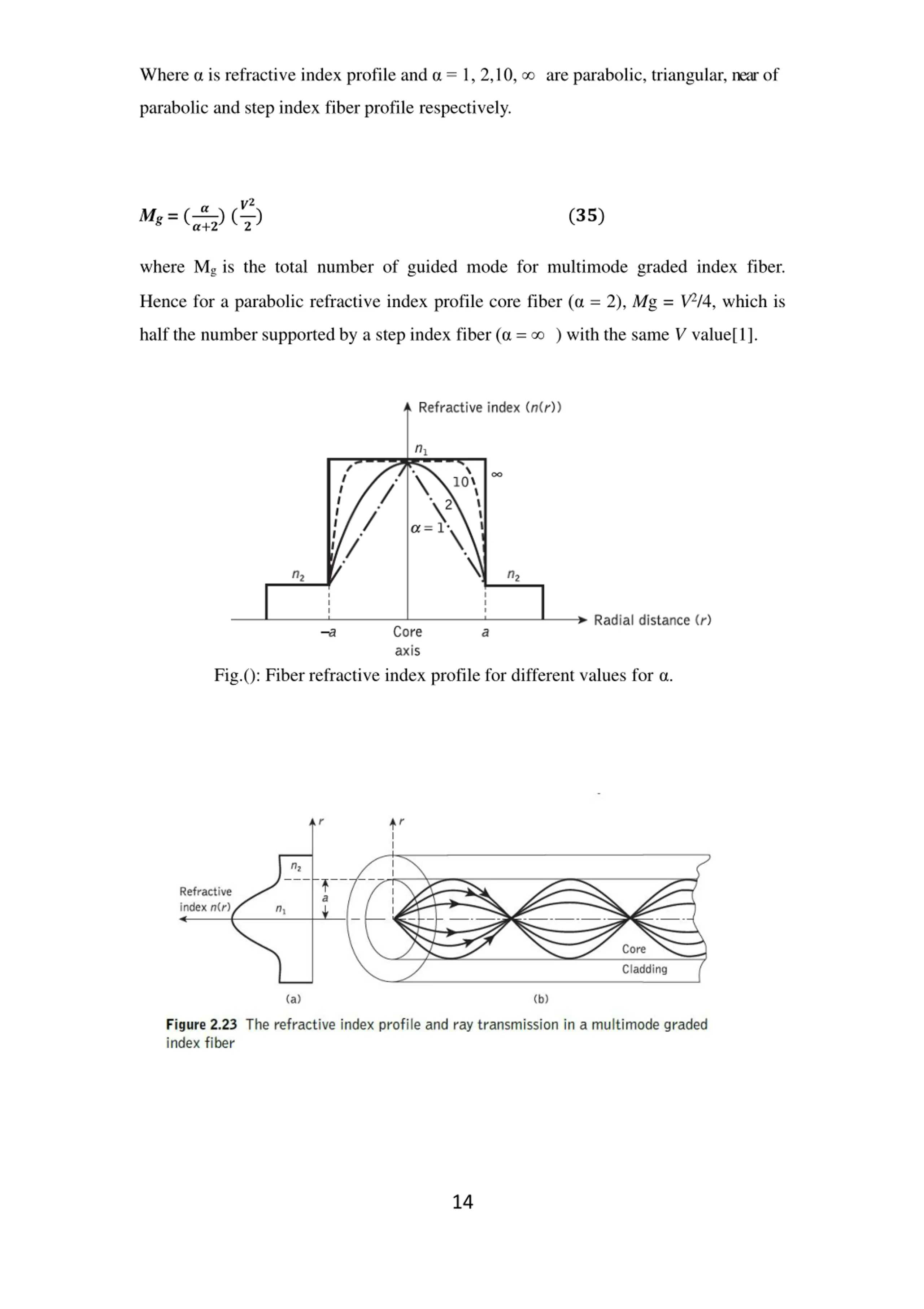 Where is refractive index profile and = 1, 2, are parabolic, triangular, near of parabolic and step index fiber profile respectively. ?? ?) ( M = ( ) (??) g ?+? ? where Mg is the total number of guided mode for multimode graded index fiber. Hence for a parabolic refractive index profile core fiber ( = 2), Mg = V2/4, which is half the number supported by a step index fiber ( = ) with the same V value[1]. Fig.(): Fiber refractive index profile for different values for . 14