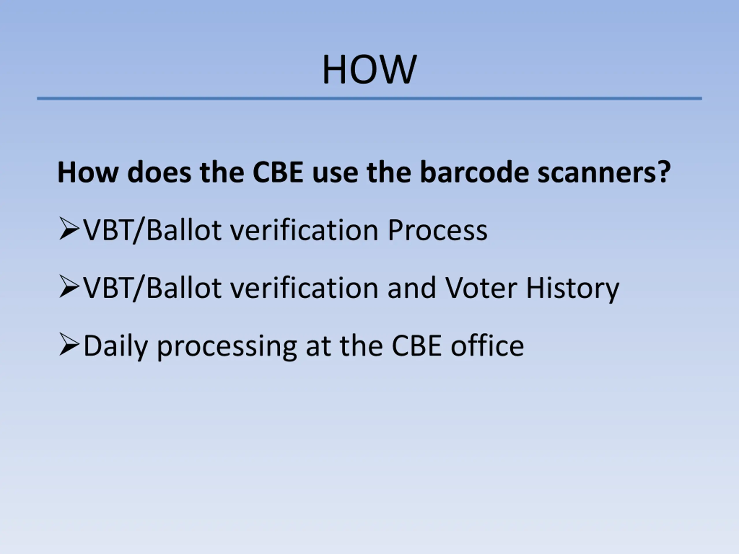 HOW How does the CBE use the barcode scanners? VBT/Ballot verification Process VBT/Ballot verification and Voter History Daily processing at the CBE office