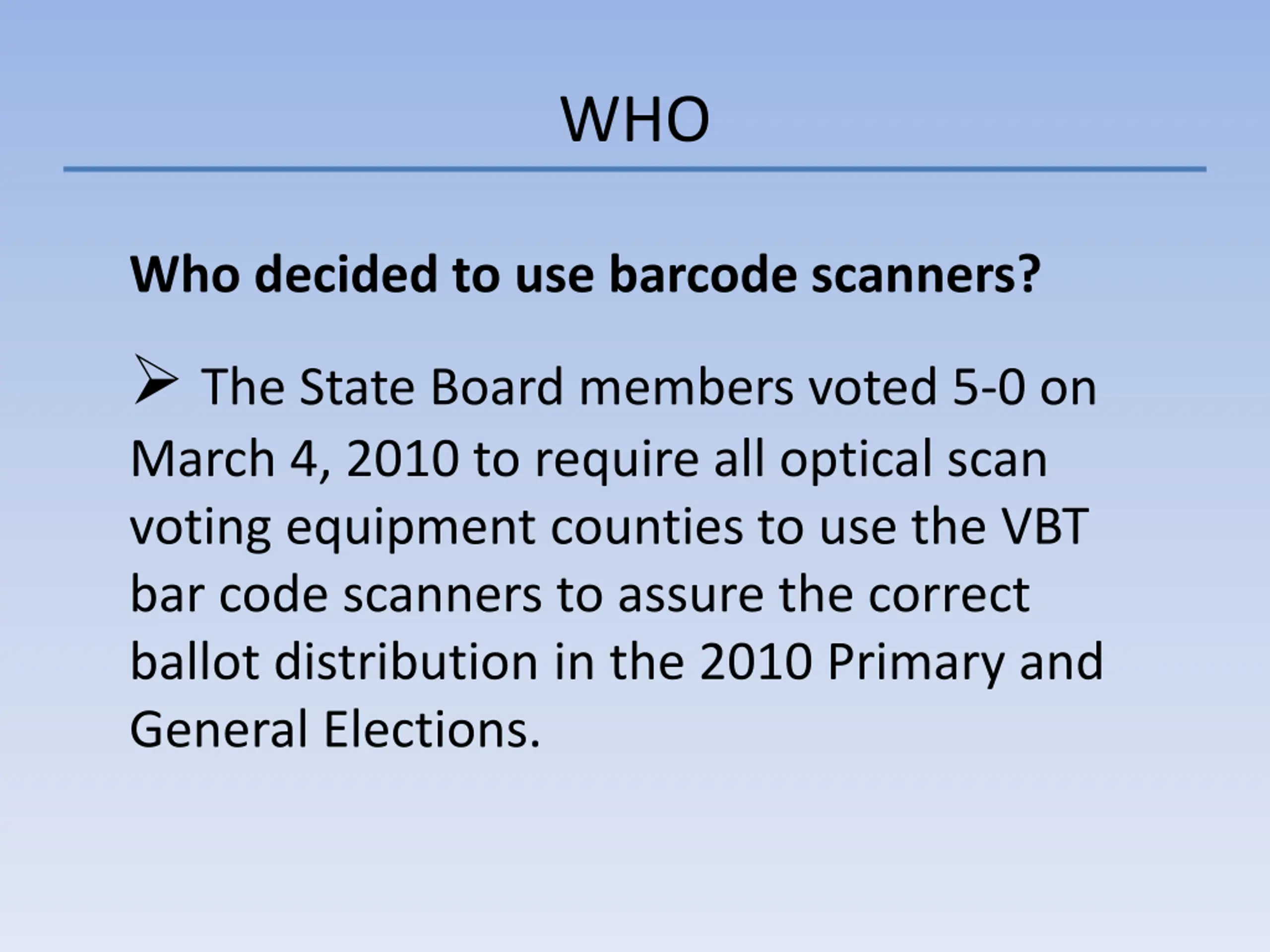 WHO Who decided to use barcode scanners? The State Board members voted 5-0 on March 4, 2010 to require all optical scan voting equipment counties to use the VBT bar code scanners to assure the correct ballot distribution in the 2010 Primary and General Elections.