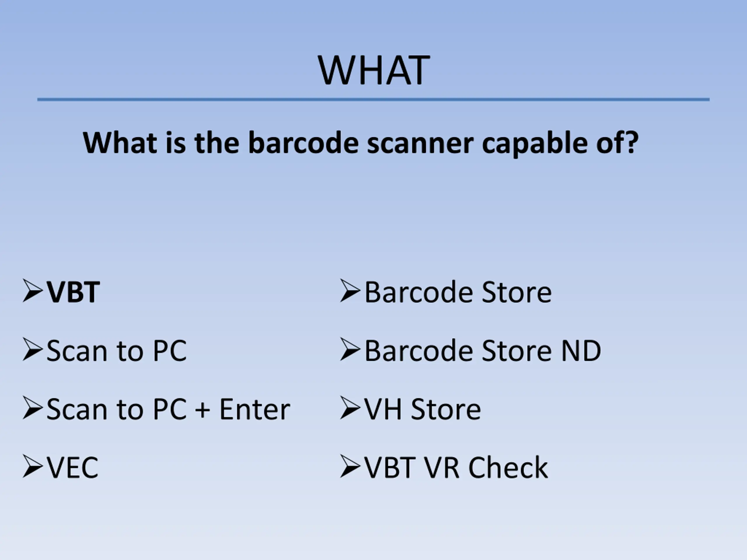 WHAT What is the barcode scanner capable of? VBT Barcode Store Scan to PC Barcode Store ND Scan to PC + Enter VH Store VEC VBT VR Check