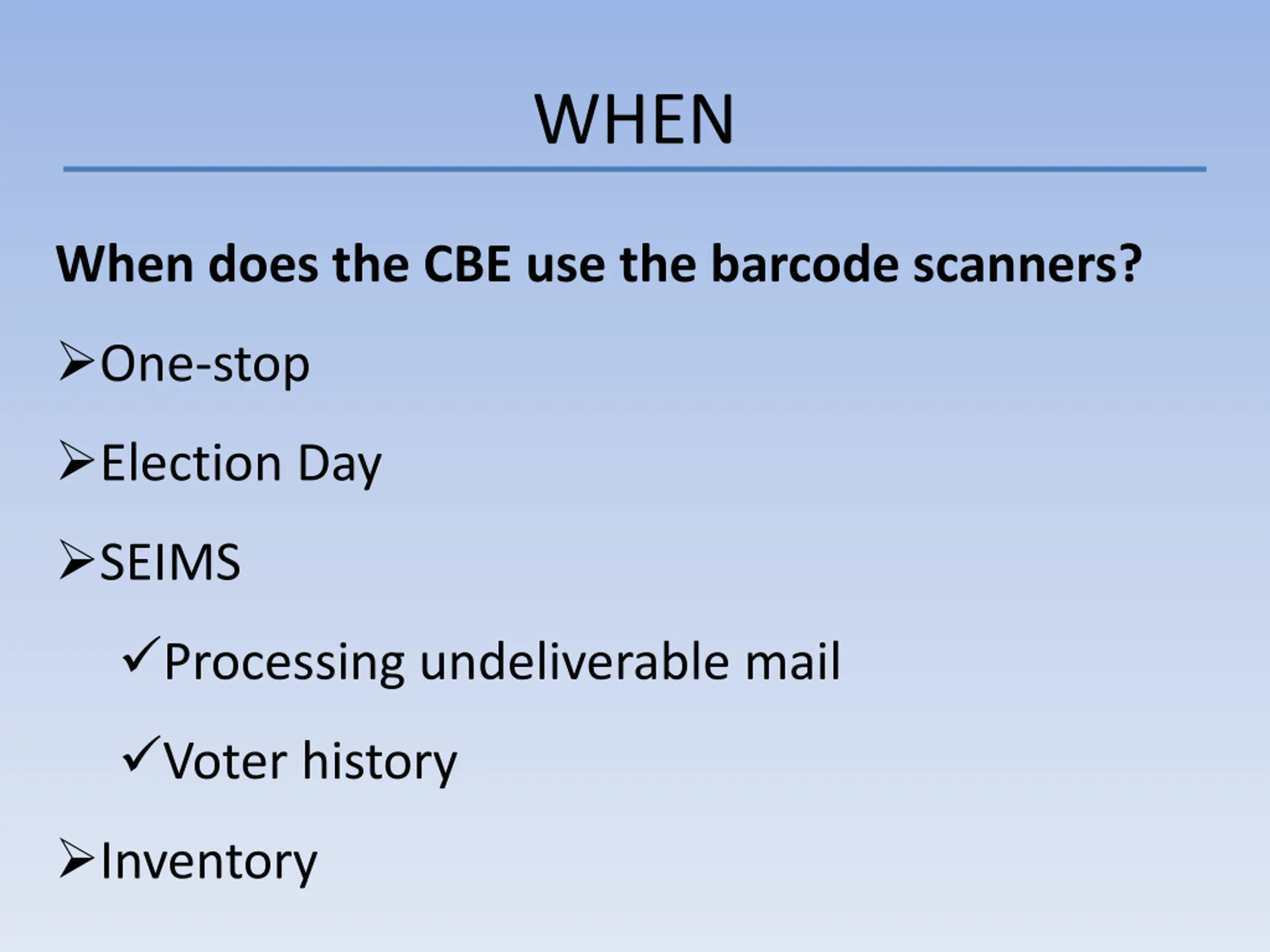 WHEN When does the CBE use the barcode scanners? One-stop Election Day SEIMS Processing undeliverable mail Voter history Inventory