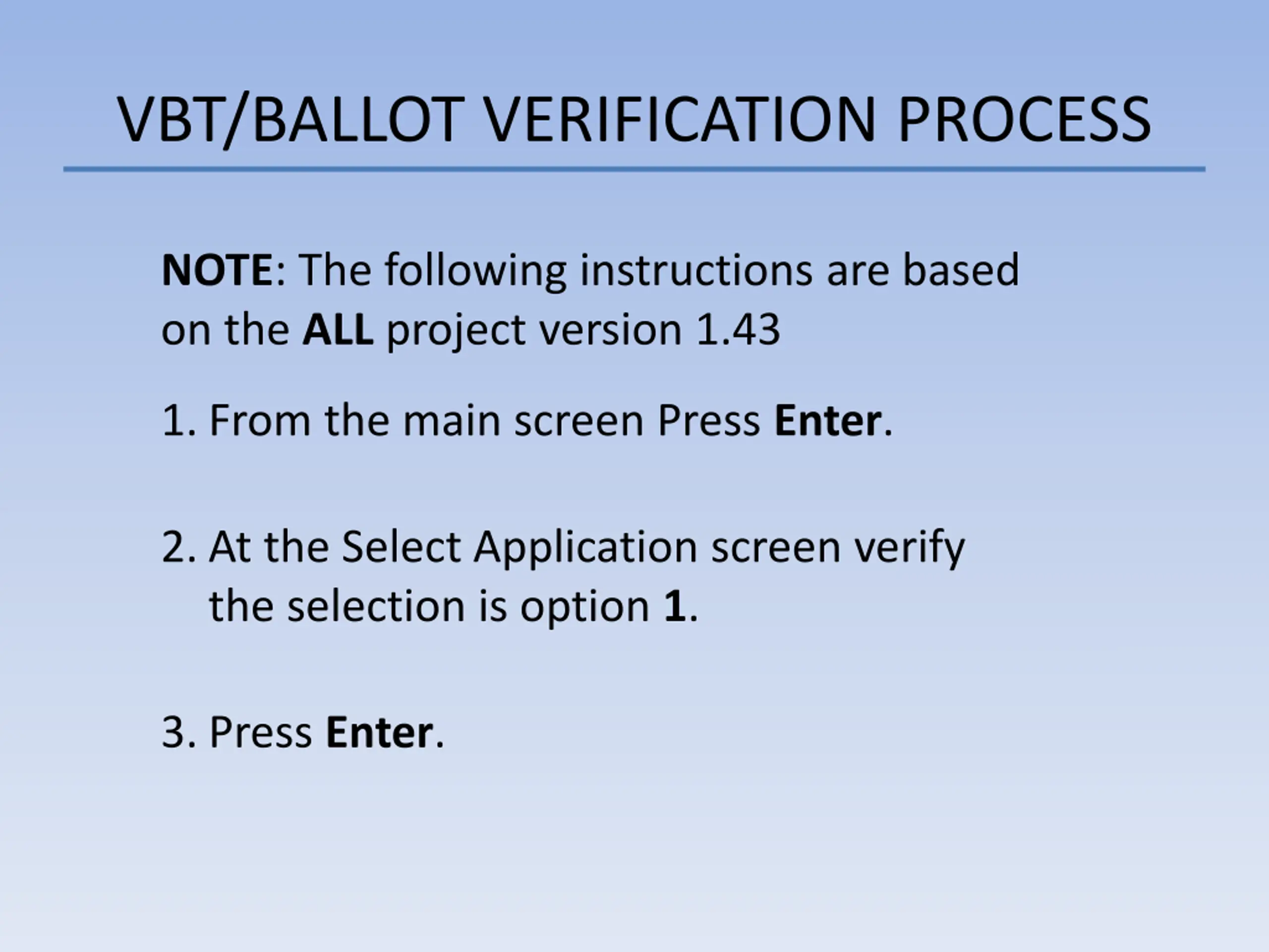 VBT/BALLOT VERIFICATION PROCESS NOTE: The following instructions are based on the ALL project version 1.43 1. From the main screen Press Enter. 2. At the Select Application screen verify the selection is option 1. 3. Press Enter.