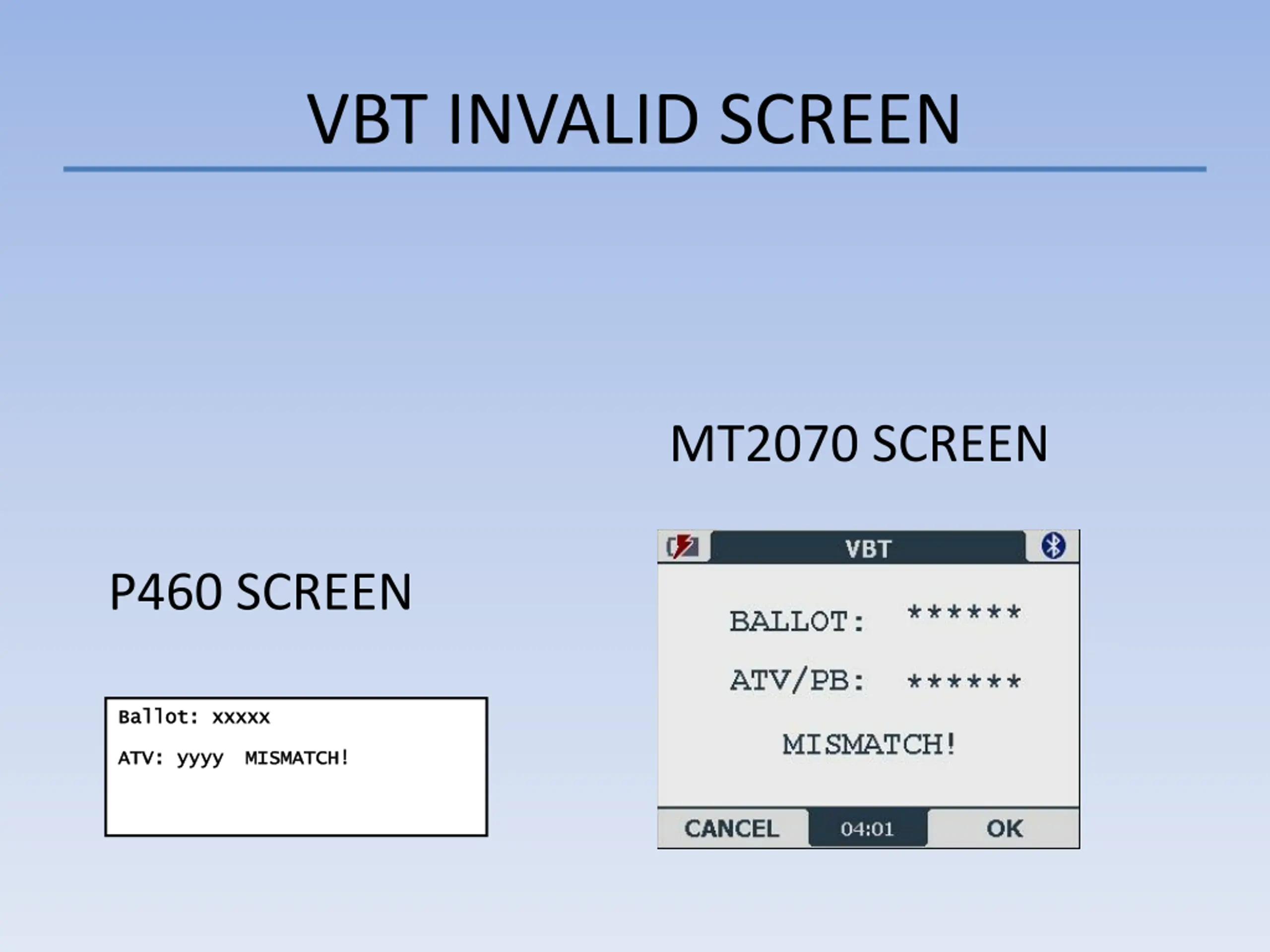 VBT INVALID SCREEN MT2070 SCREEN P460 SCREEN Ballot: Ballot: xxxxx xxxxx ATV: ATV: yyyy yyyy MISMATCH! MISMATCH!