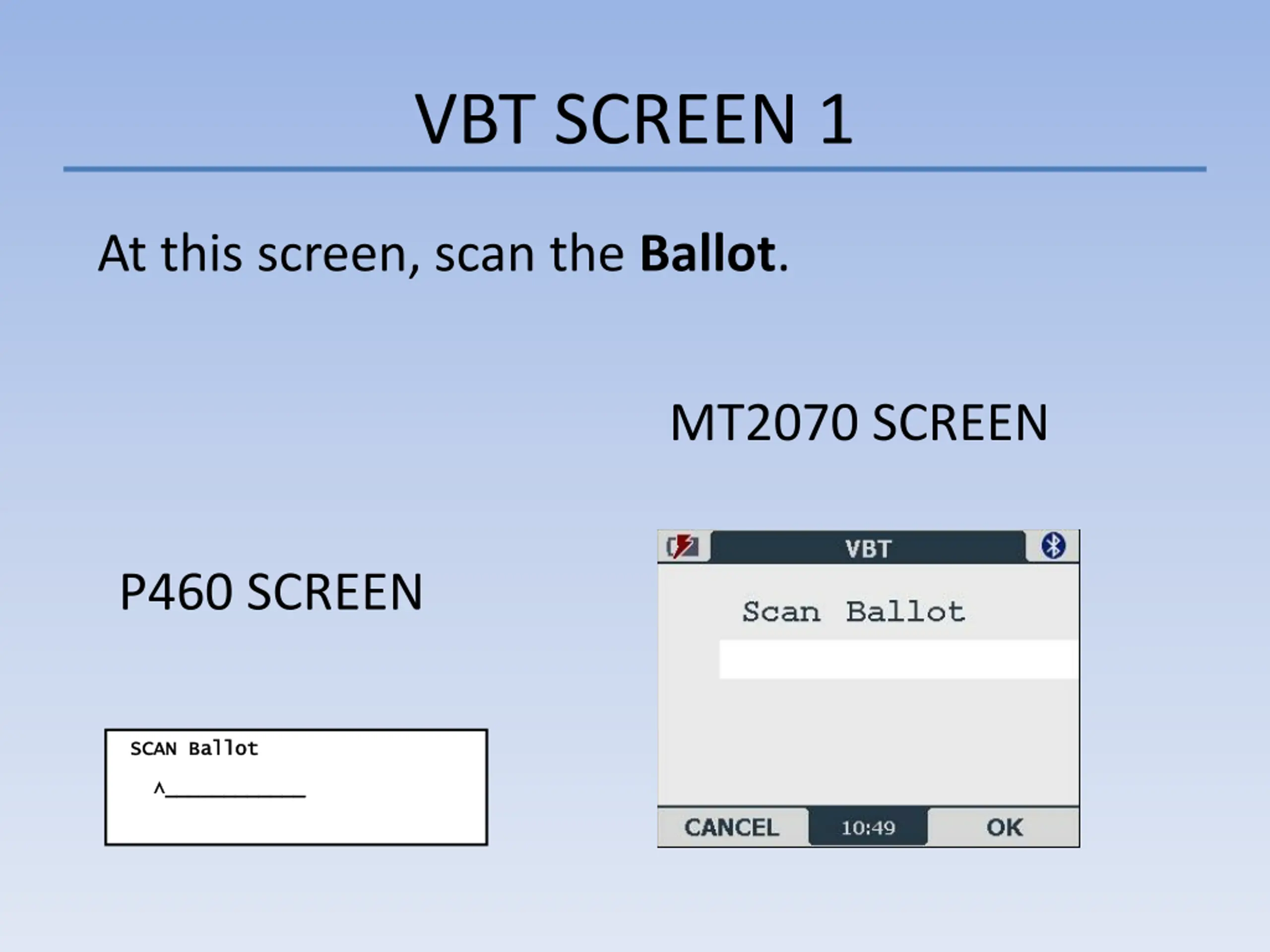 VBT SCREEN 1 At this screen, scan the Ballot. MT2070 SCREEN P460 SCREEN SCAN Ballot SCAN Ballot ^____________ ^____________