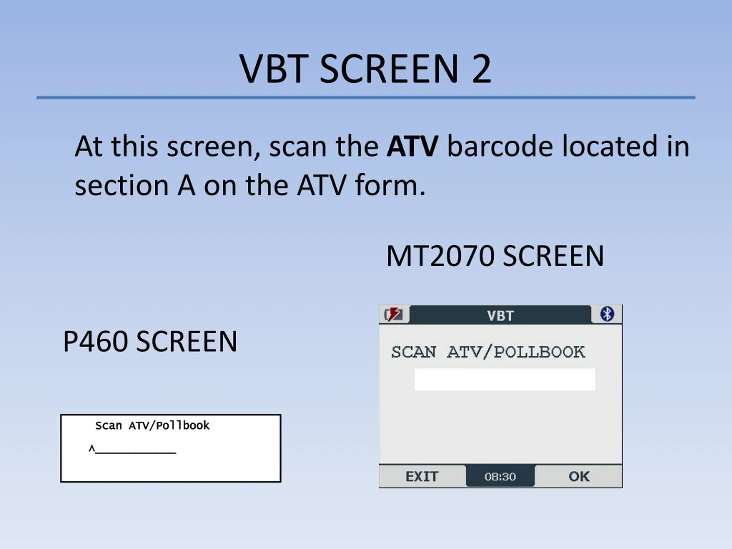 VBT SCREEN 2 At this screen, scan the ATV barcode located in section A on the ATV form. MT2070 SCREEN P460 SCREEN Scan ATV/Pollbook Scan ATV/Pollbook ^____________ ^____________