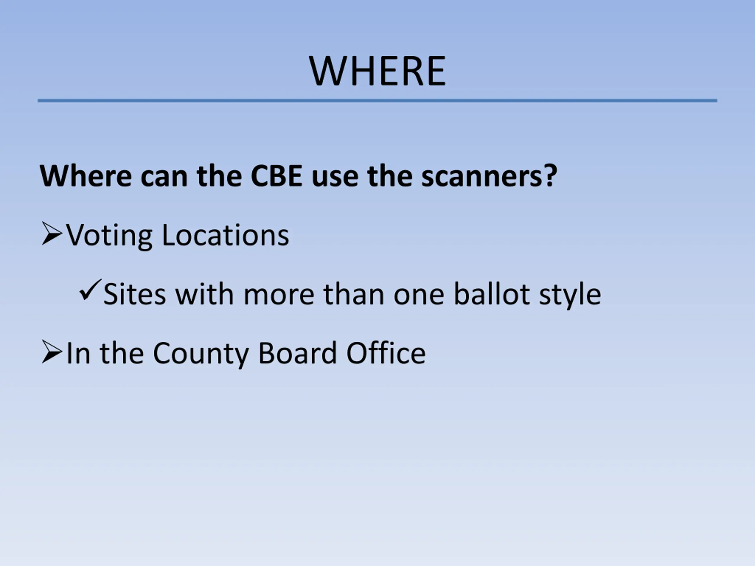 WHERE Where can the CBE use the scanners? Voting Locations Sites with more than one ballot style In the County Board Office