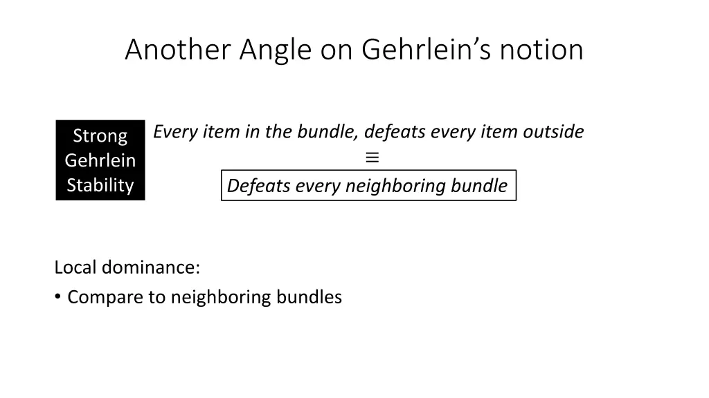 Another Angle on Gehrleins notion Every item in the bundle, defeats every item outside Strong Gehrlein Stability Defeats every neighboring bundle Local dominance: Compare to neighboring bundles