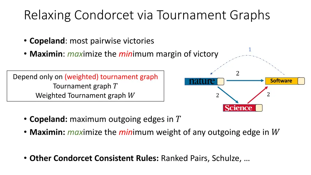 Relaxing Condorcet via Tournament Graphs Copeland: most pairwise victories Maximin: maximize the minimum margin of victory 1 2 Depend only on (weighted) tournament graph Tournament graph ? Weighted Tournament graph ? Software 2 2 Copeland: maximum outgoing edges in ? Maximin: maximize the minimum weight of any outgoing edge in ? Other Condorcet Consistent Rules:Ranked Pairs, Schulze,