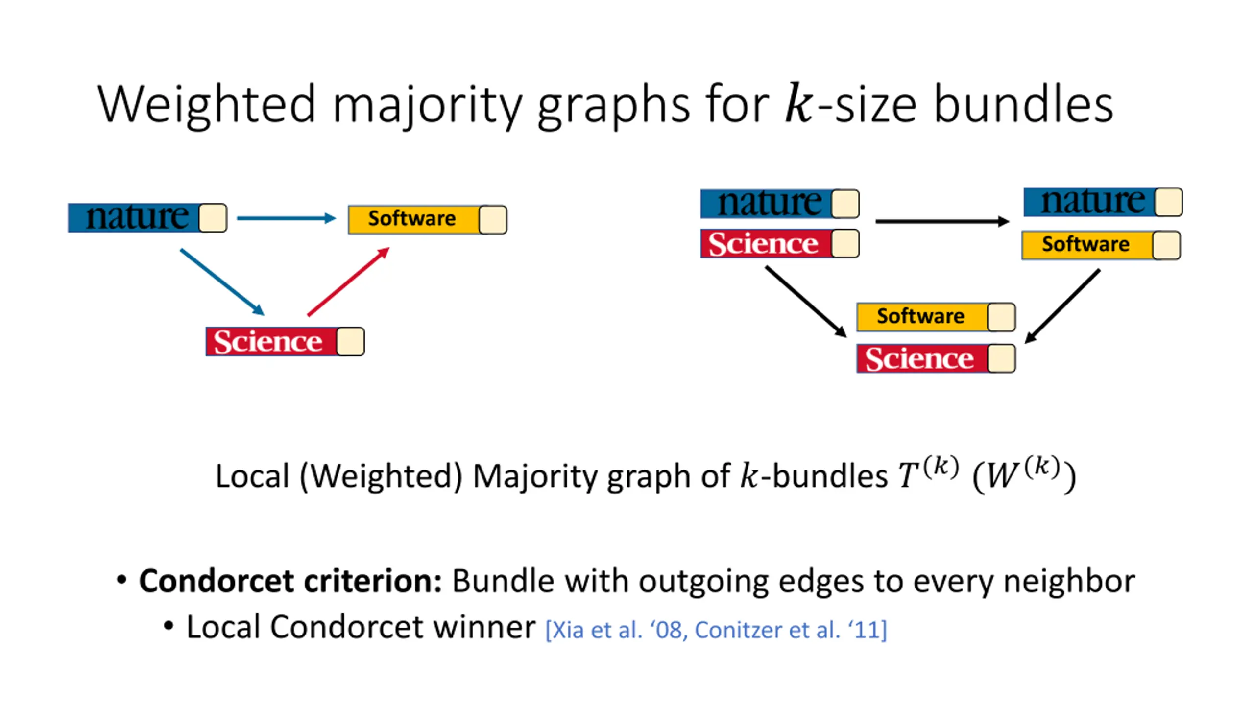Weighted majority graphs for ?-size bundles Software Software Software Local (Weighted) Majority graph of ?-bundles ?(?) (?(?)) Condorcet criterion: Bundle with outgoing edges to every neighbor Local Condorcet winner [Xia et al. 08, Conitzer et al. 11]