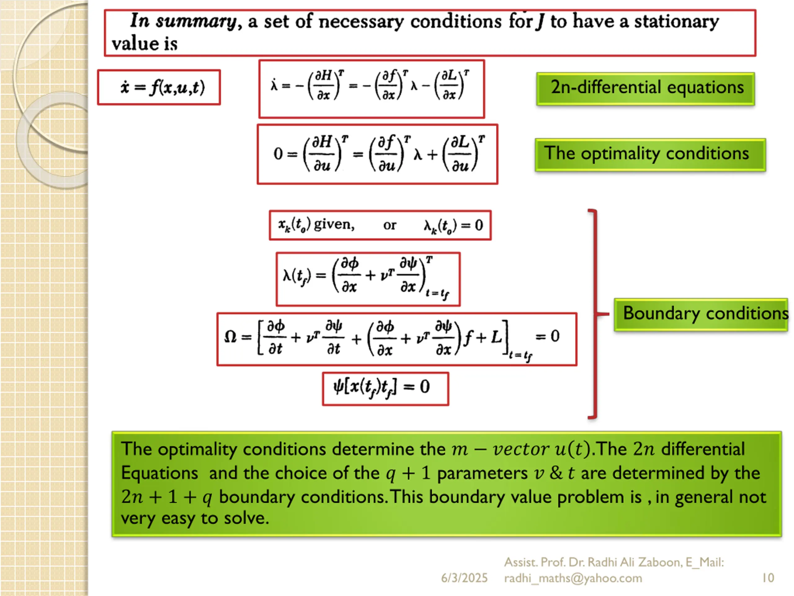 2n-differential equations The optimality conditions Boundary conditions The optimality conditions determine the ? ?????? ? ? .The 2? differential Equations and the choice of the ? + 1 parameters ? & ? are determined by the 2? + 1 + ? boundary conditions. This boundary value problem is , in general not very easy to solve. Assist. Prof. Dr. Radhi Ali Zaboon, E_Mail: radhi_maths@yahoo.com 6/3/2025 10
