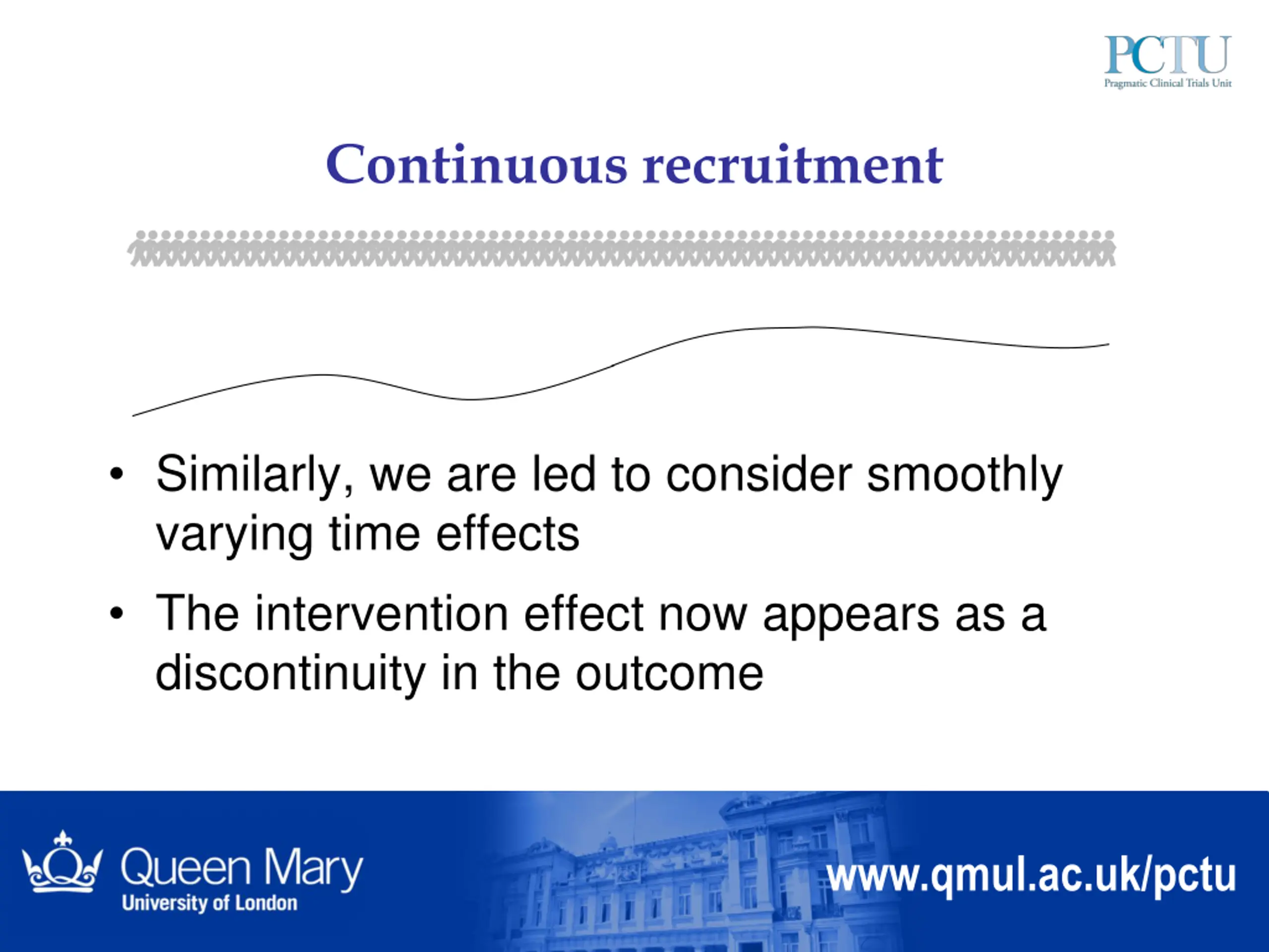 Continuous recruitment Similarly, we are led to consider smoothly varying time effects The intervention effect now appears as a discontinuity in the outcome www.qmul.ac.uk/pctu