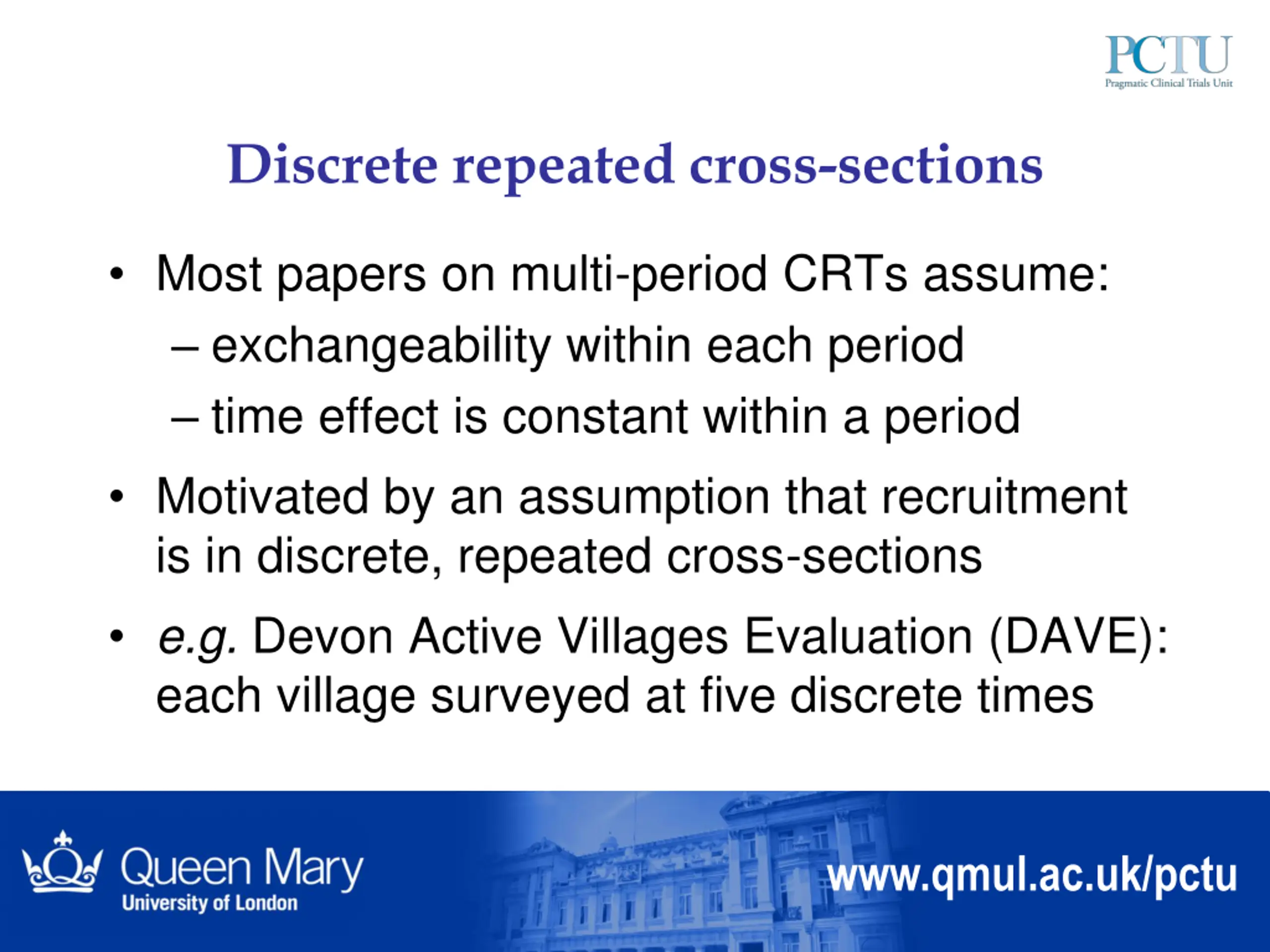 Discrete repeated cross-sections Most papers on multi-period CRTs assume: exchangeability within each period time effect is constant within a period Motivated by an assumption that recruitment is in discrete, repeated cross-sections e.g. Devon Active Villages Evaluation (DAVE): each village surveyed at five discrete times www.qmul.ac.uk/pctu