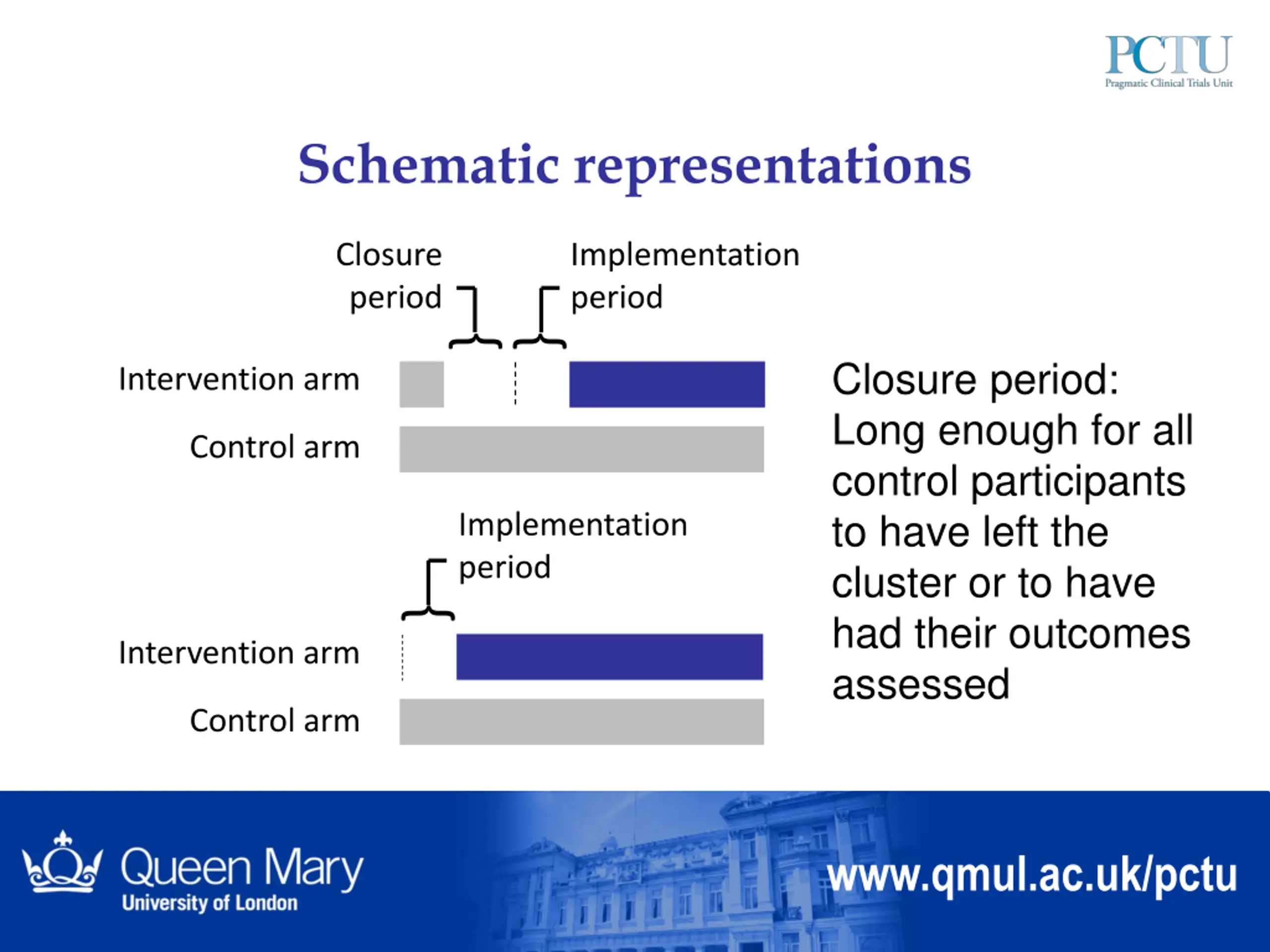 Schematic representations Closure period{ Implementation period { Closure period: Long enough for all control participants to have left the cluster or to have had their outcomes assessed Intervention arm Control arm Implementation period { Intervention arm Control arm www.qmul.ac.uk/pctu